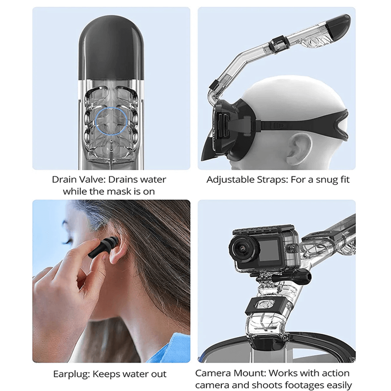 Håll dig bekväm och obehindrad med vår lätta design. Justerbara remmar säkerställer en perfekt passform, medan den avtagbara och hopfällbara snorkeln gör förvaring och transport till en fröjd.