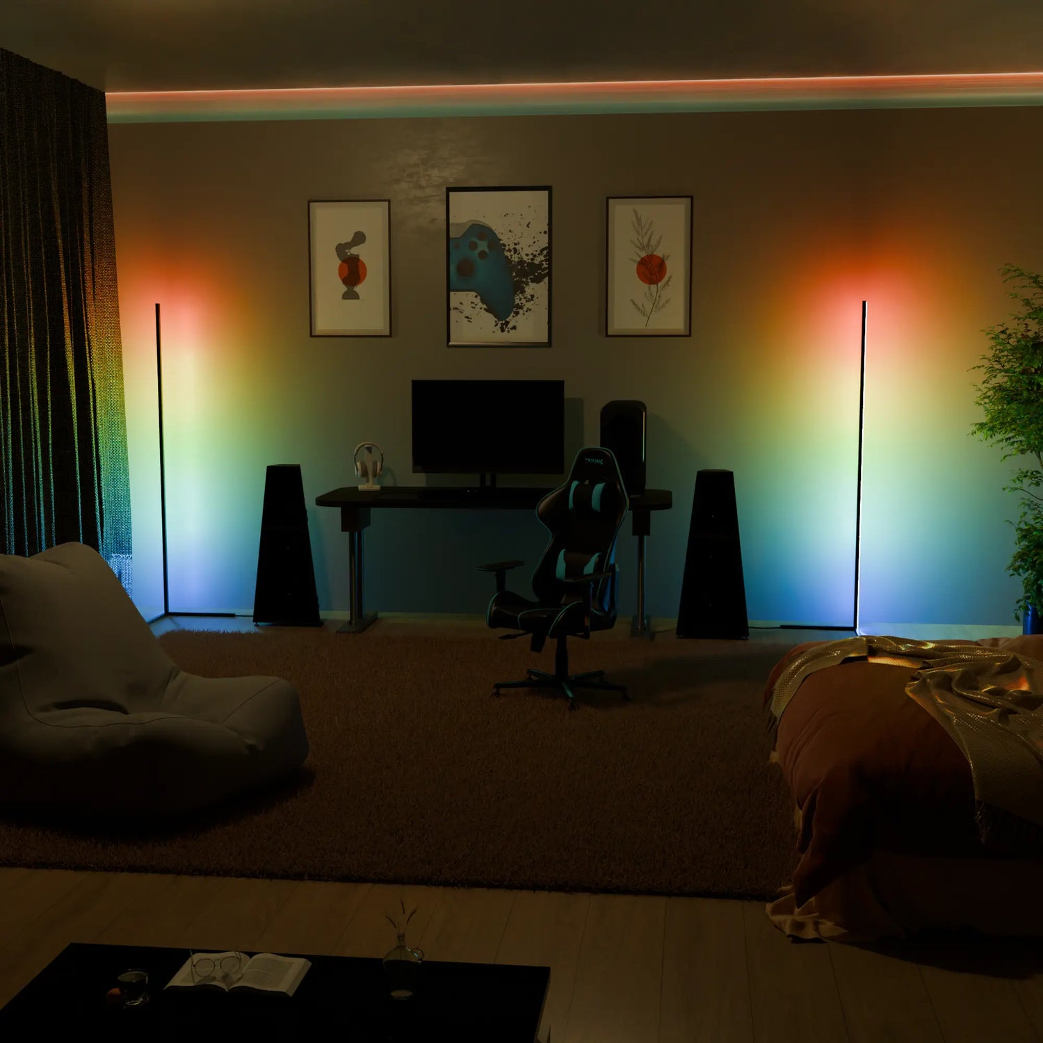 Denna moderna golvlampa ger stilfull och atmosfärisk belysning till vilket rum som helst. Med sin eleganta design och mångsidiga färginställningar är den perfekt för att skapa den önskade stämningen, oavsett om det är för en mysig kväll eller en livlig sammankomst. Denna lampa är idealisk för användning i vardagsrum, sovrum eller kontor hemma, och ger en samtida touch till din inredning. Njut av den perfekta belysningen för varje tillfälle med denna vackra golvlampa.