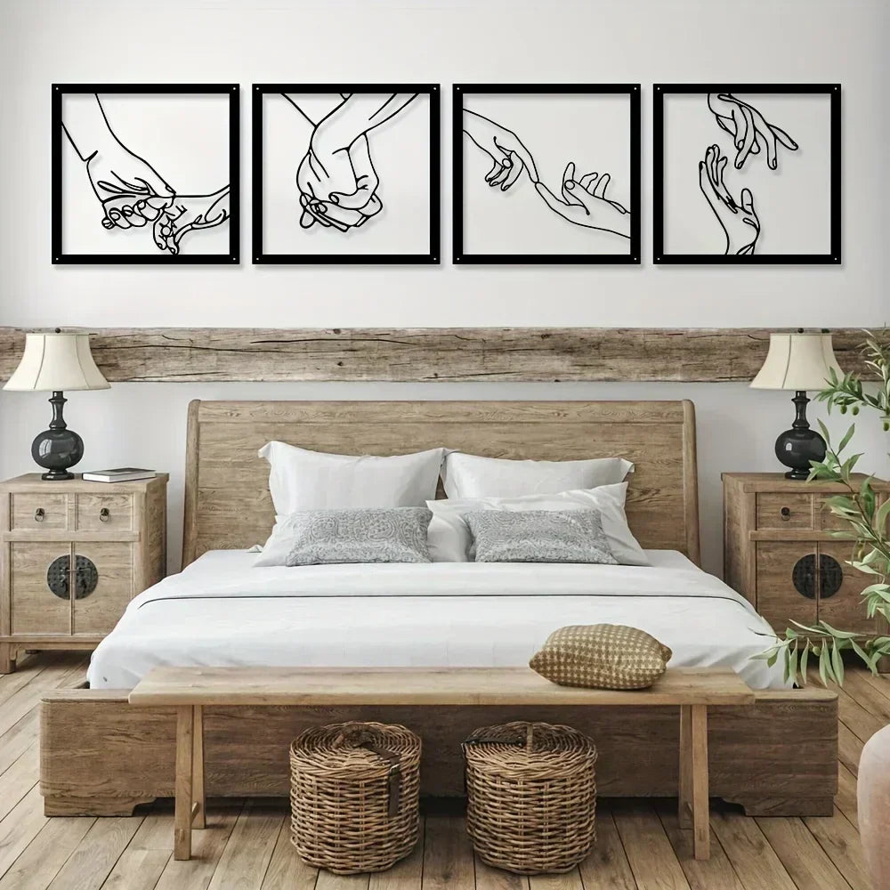 Denna väggdekoration är ett subtilt men kraftfullt uttryck för mänsklig kontakt. Detta set med fyra minimalistiska konstverk fångar essensen av beröring och känslomässig koppling i strömlinjeformade linjer och en modern design. Den metallram lägger till en samtida stil till varje inredning, medan de olika handgesterna väcker en känsla av värme och intimitet. Denna dekoration är perfekt för att tillföra en personlig och meningsfull touch till vilket rum som helst.