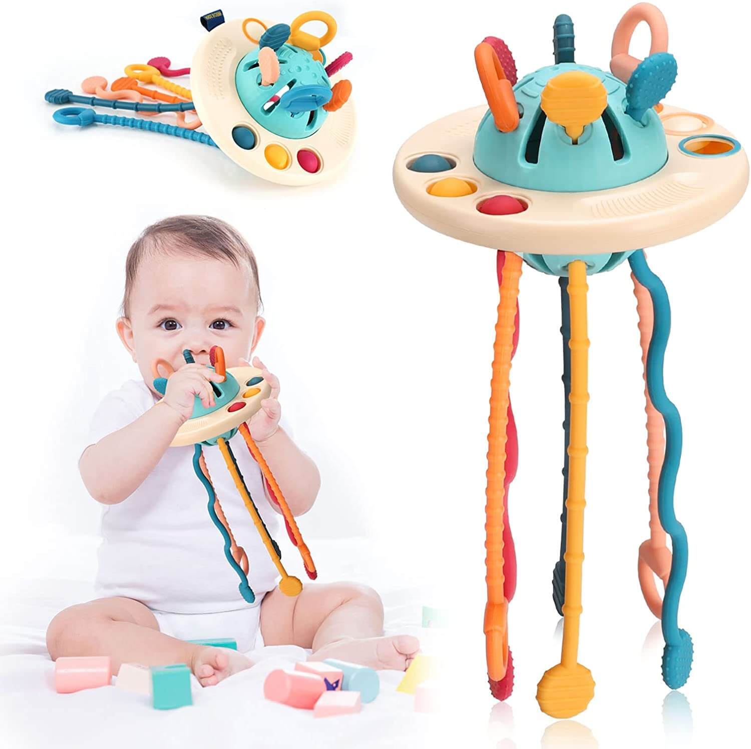 Den roliga UFO silikon dragleksak från Montessori är utrustad med mjuka knappar som uppmuntrar barnet att röra och trycka på dem, vilket tränar de små fingrarnas flexibilitet. De texturerade sladdarna kan dras från sida till sida för att låta barnet känna olika ljud och vibrationer.