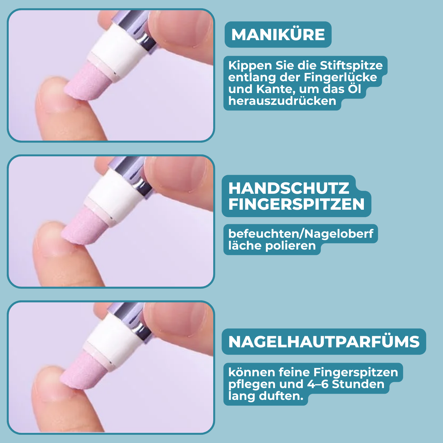Denna nagelolja återställer glansen! Slut på spruckna toppar och fnasig nagelband! Med denna 3-i-1 nagelvårdspenna vårdar, stärker och förskönar du dina naglar på ett steg utan kladd. Den naturliga formeln med värdefulla oljor ger friska naglar, märkbart jämnare hud och långvarig glans med en aning av kameliadoft.