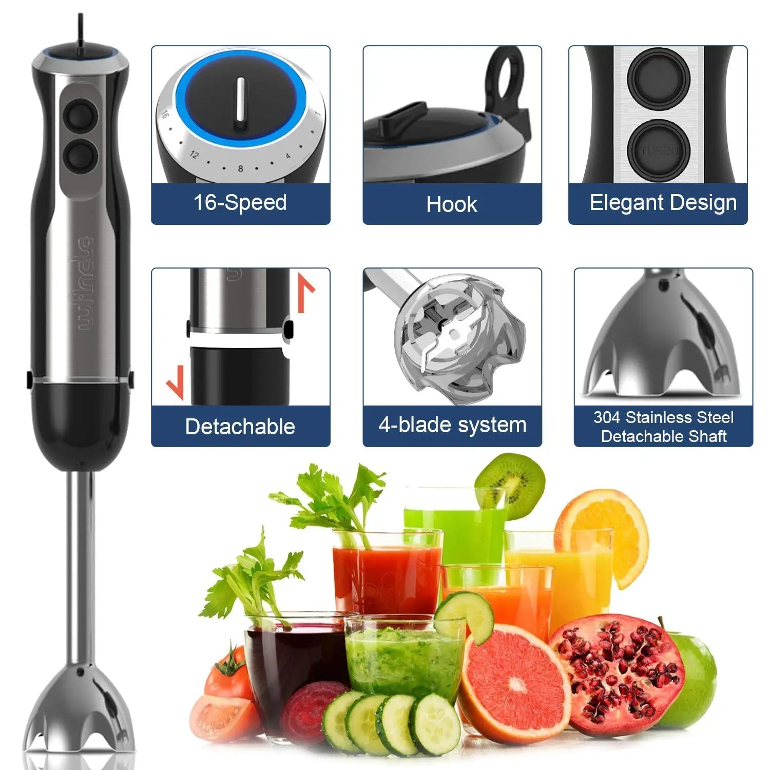 Upplev den perfekta kombinationen av bekvämlighet och mångsidighet med vår Immersion Hand Blender, som har 16 variabla hastigheter och en kraftfull Turbo Boost-funktion. Designad för att höja dina kulinariska färdigheter, är denna mixer ett måste i varje kök, vilket gör matlagningen enkel och rolig.