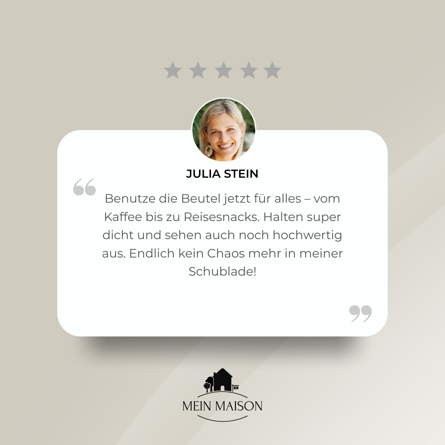 Oavsett om det är mjöl, nötter, örter eller skruvar – med SealBag Pro förblir allt rent, torrt och skyddat. De återförslutbara zip-påsarna med aluminiumfolie isolerar perfekt mot luft, fukt och ljus – helt utan plastavfall eller billiga klämmor.