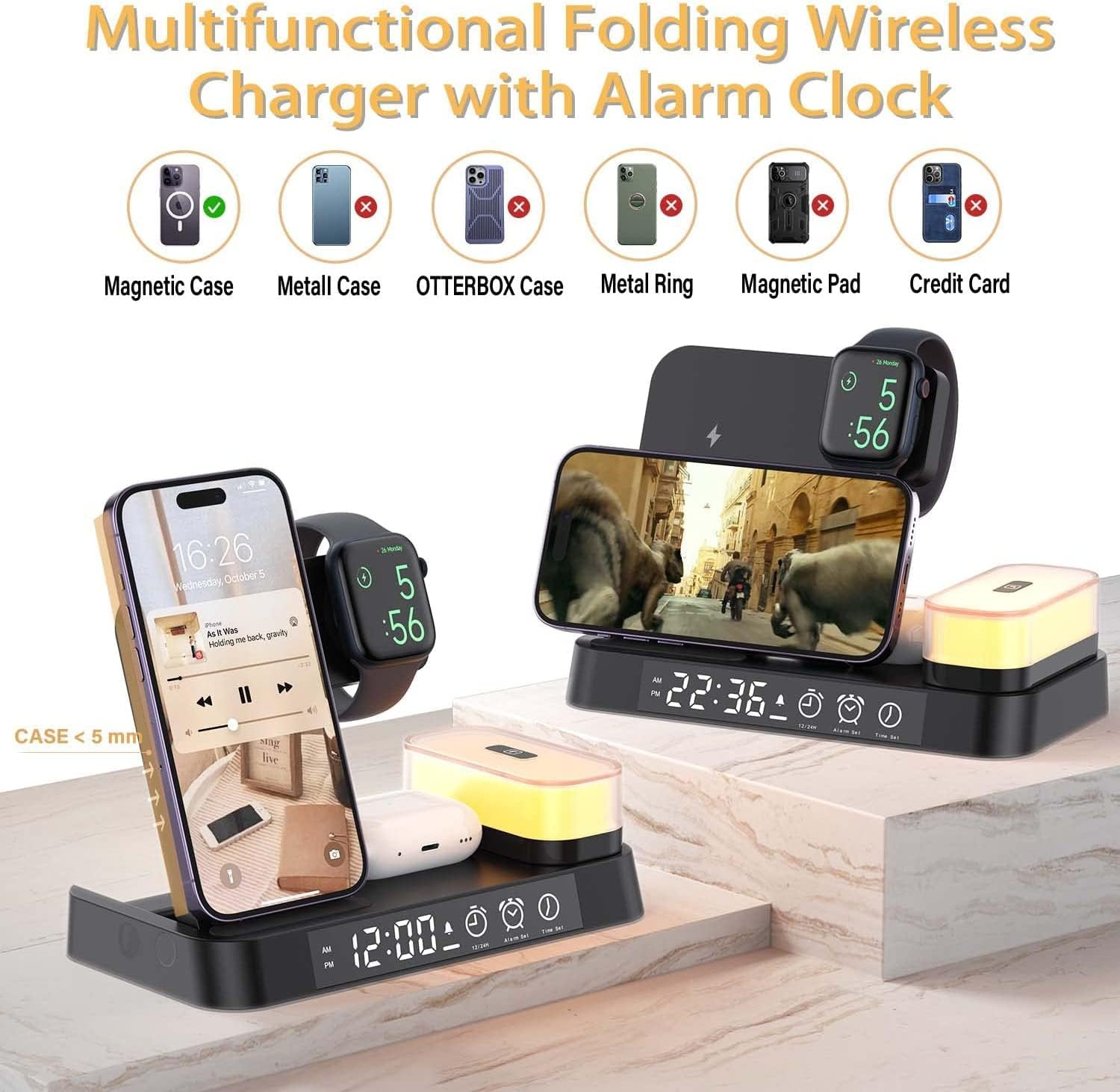 Vår 5 i 1 laddningsstation är den ultimata lösningen för att hålla dina enheter strömförsörjda och ditt utrymme organiserat. Denna multifunktionella laddningsstation kombinerar en trådlös laddare, Type C-kontakt, väckarklocka och nattlampa i en stilren, kompakt design.