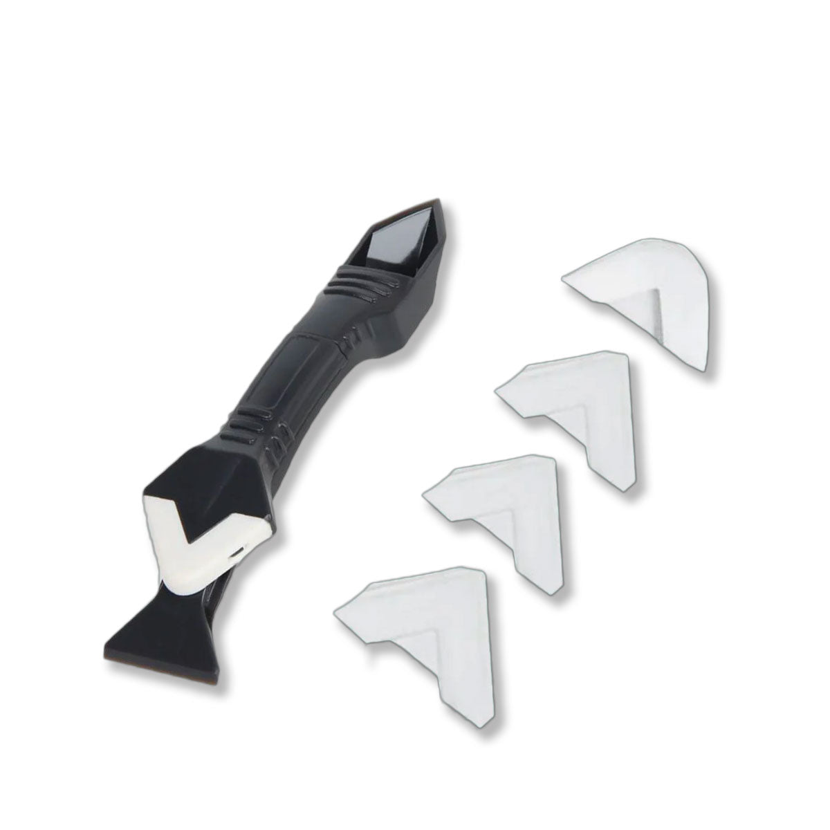 5-i-1 verktyg för tätning: Utformad för att antingen applicera eller avlägsna fogmassa. Kan användas som en silikonspackel, en skonsam skrapa för rester eller ett vasst blad.
