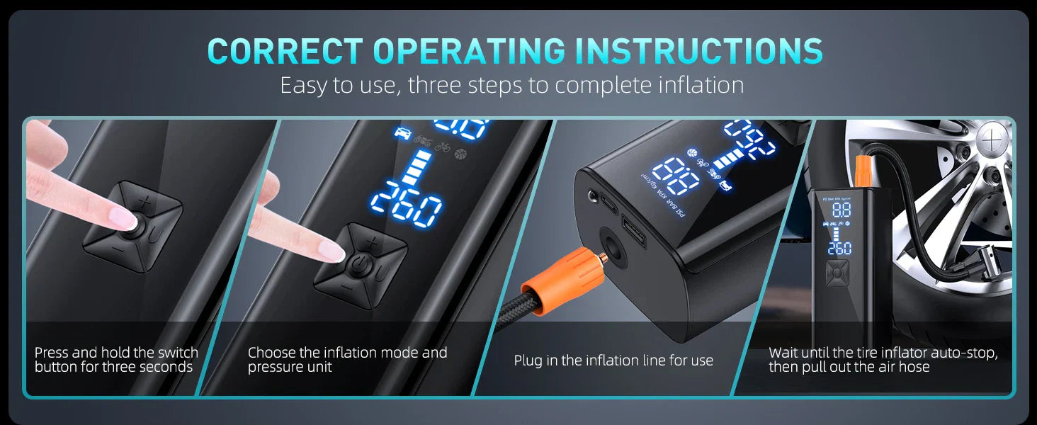 Say goodbye to roadside delays and costly trips to the gas station. With AirSwift, att blåsa upp bil däck, cykelhjul, sportbollar och mer är så enkelt som att trycka på en knapp. Denna lätta, portabla enhet är din ultimata följeslagare för effektiv, problemfri uppblåsning—när som helst, var som helst.