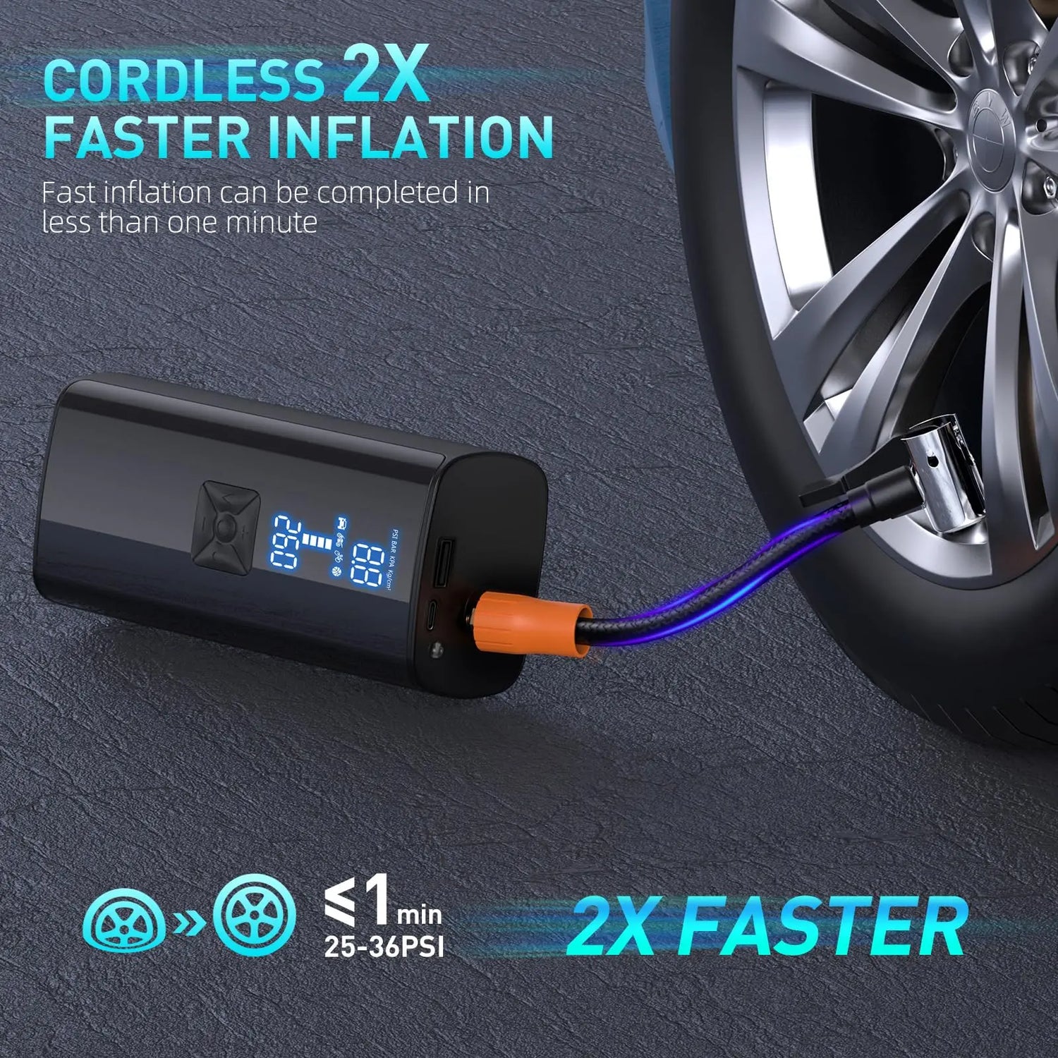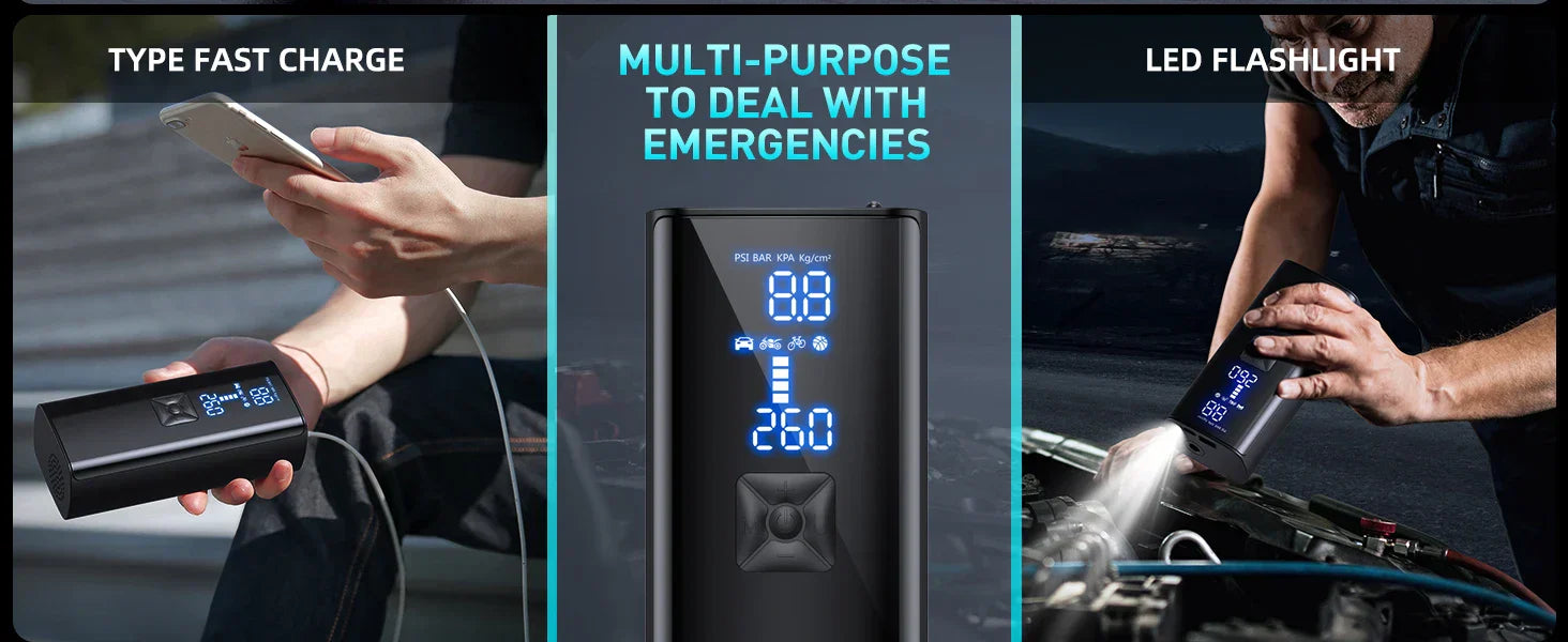 Med en tryckkapacitet på 150 PSI och ett luftflöde på 36L/Min är denna portabla luftpump designad för hastighet. Fyll ett delvis platt bildäck på 1 minut eller blås upp det helt på bara 5 minuter, vilket sparar tid vid nödsituationer.