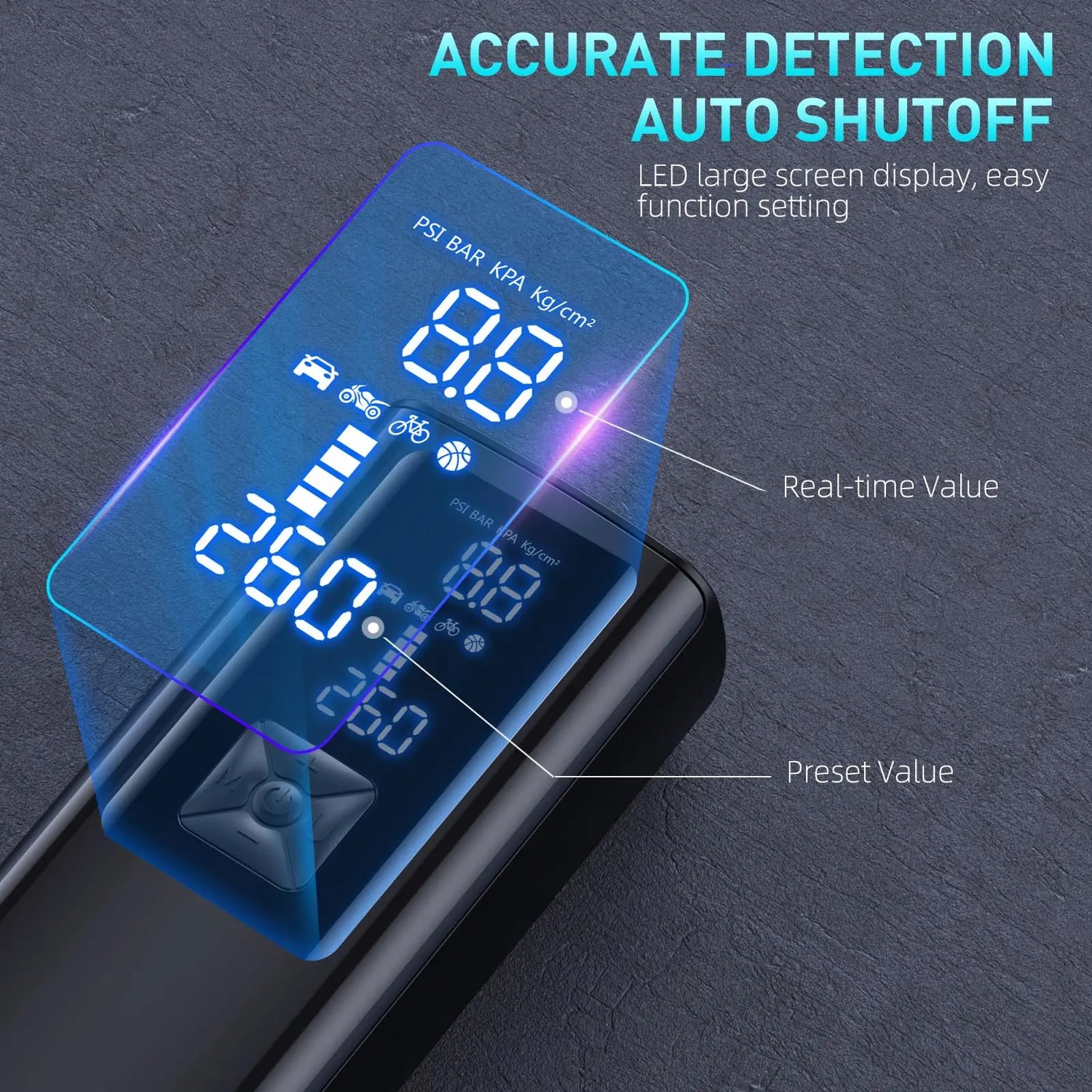 Njut av problemfri drift med förinställda lägen för cyklar, motorcyklar, bilar och bollar. Välj helt enkelt önskat tryck, anslut adaptern och tryck på en knapp. AirSwift blåser upp till exakt tryck och stänger automatiskt av, vilket säkerställer säkerhet och precision.