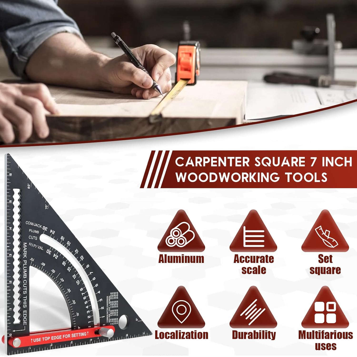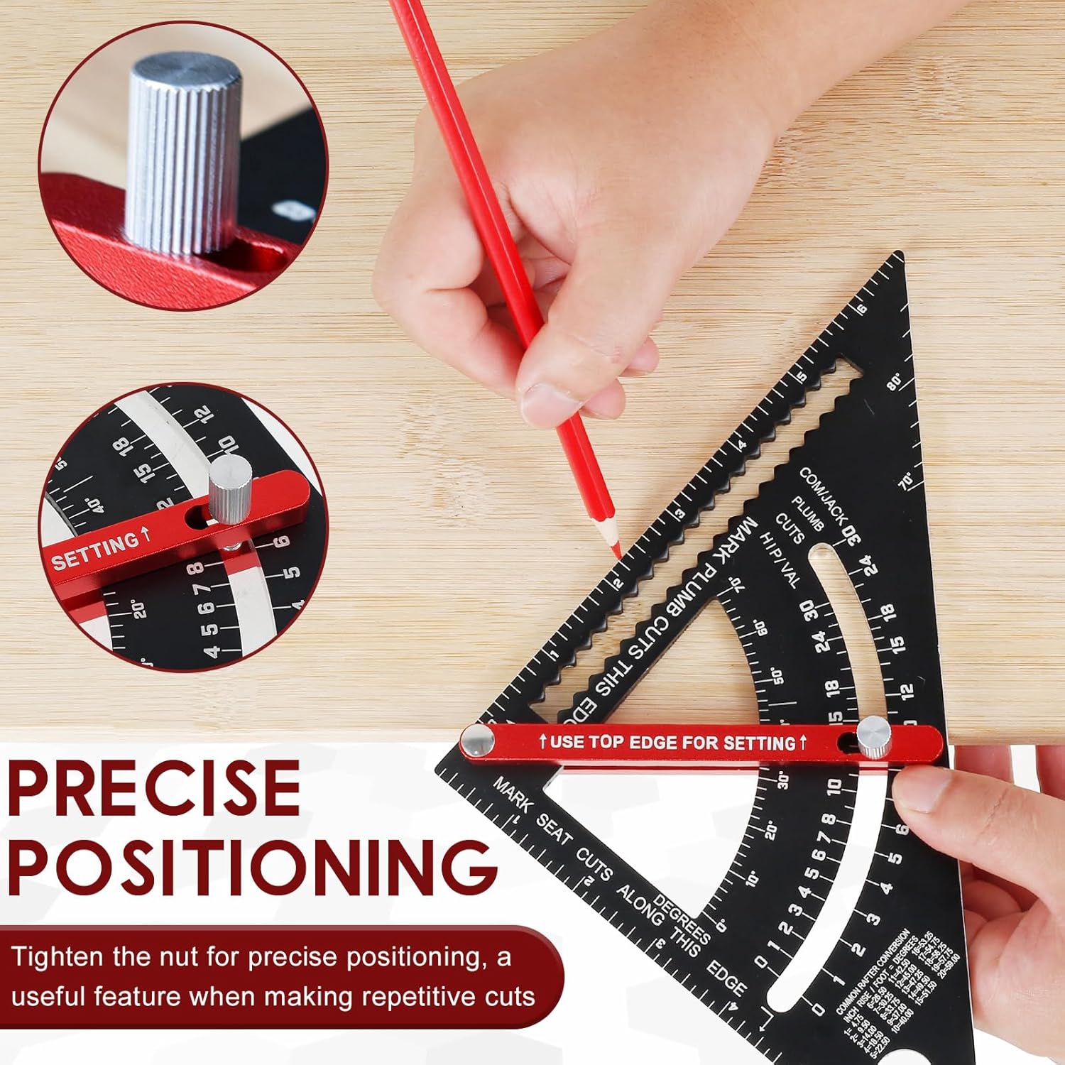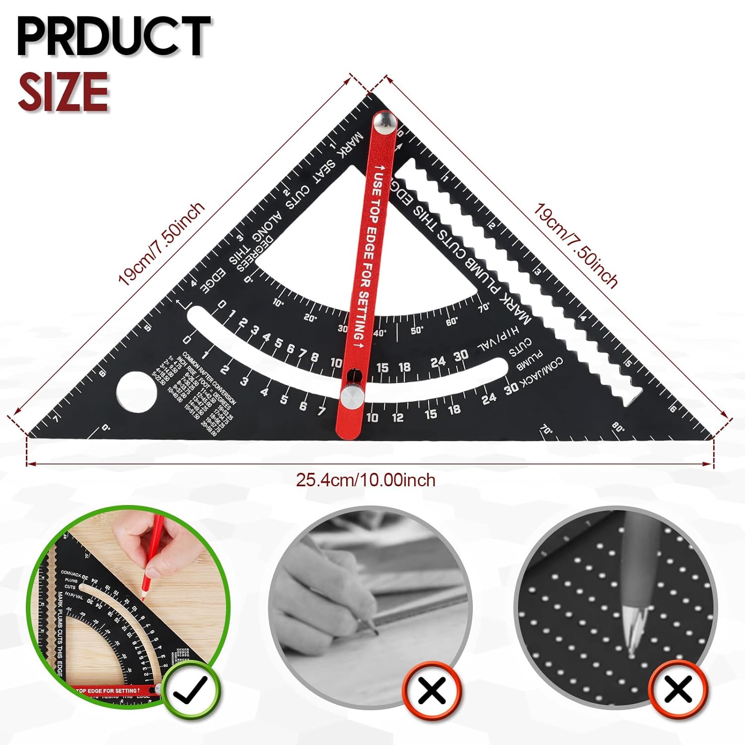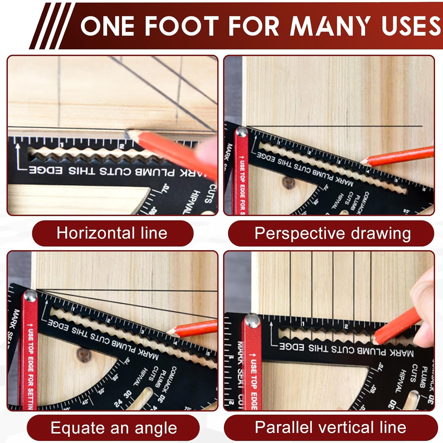 ✔️ Multifunktionellt 4-i-1-verktyg – Använd som linjal, gradskiva, takkrok och markeringshjälpmedel – perfekt för träbearbetning, metall, kakel eller konstruktion.