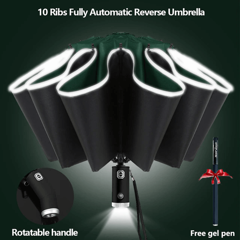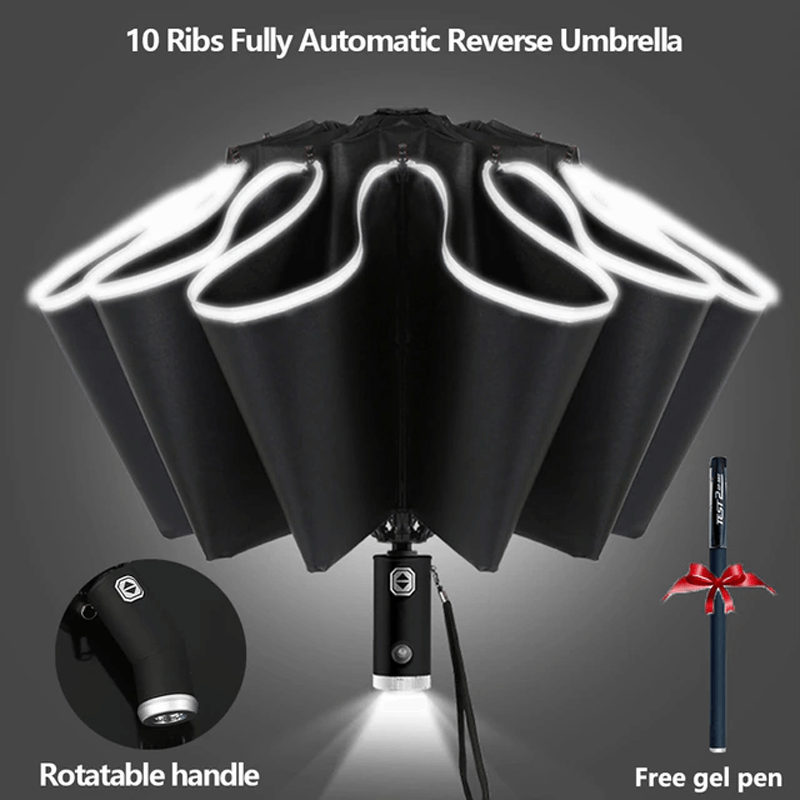 Dess innovativa omvända hopfällningsdesign, tillsammans med inbyggda LED-lampor, ser till att du håller dig torr samtidigt som din väg belyses. En vindtålig konstruktion och en kompakt form förstärker ytterligare dess praktiska användning.