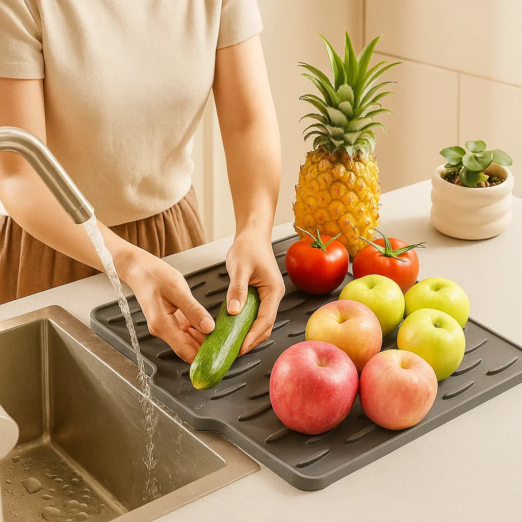 Silikon droppmattan är inte bara funktionell, utan också lätt att förvara. Tack vare sitt flexibla material kan den enkelt rullas ihop eller förvaras i en låda när den inte används, så att den alltid är lättillgänglig.