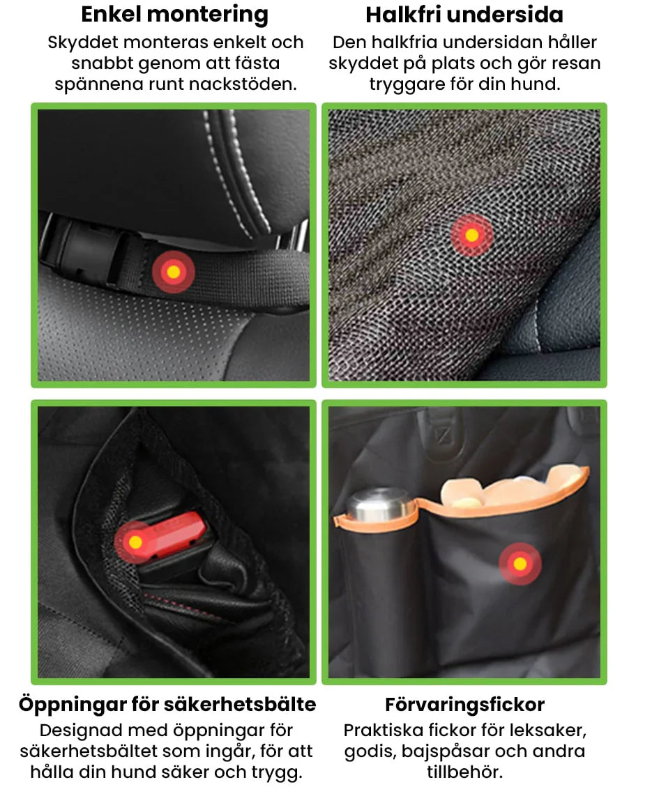 Skyddet har en halkfri undersida som håller det stabilt på plats, även under körning. Det gör att hunden sitter tryggt och inte glider runt, vilket skapar en säkrare och lugnare resa för både hund och förare.