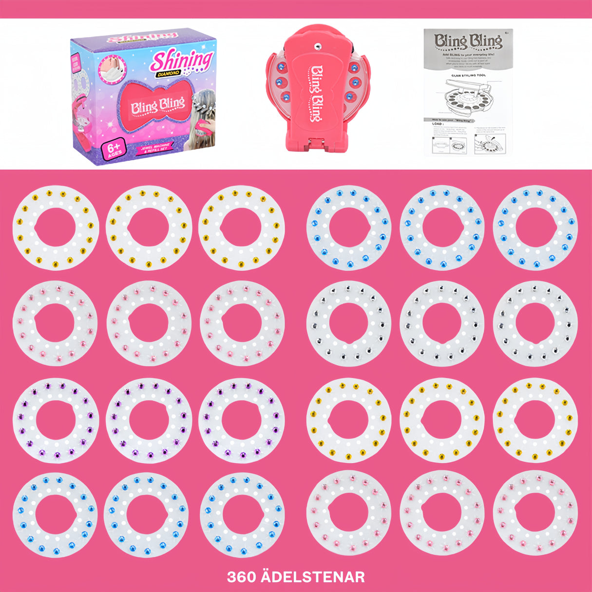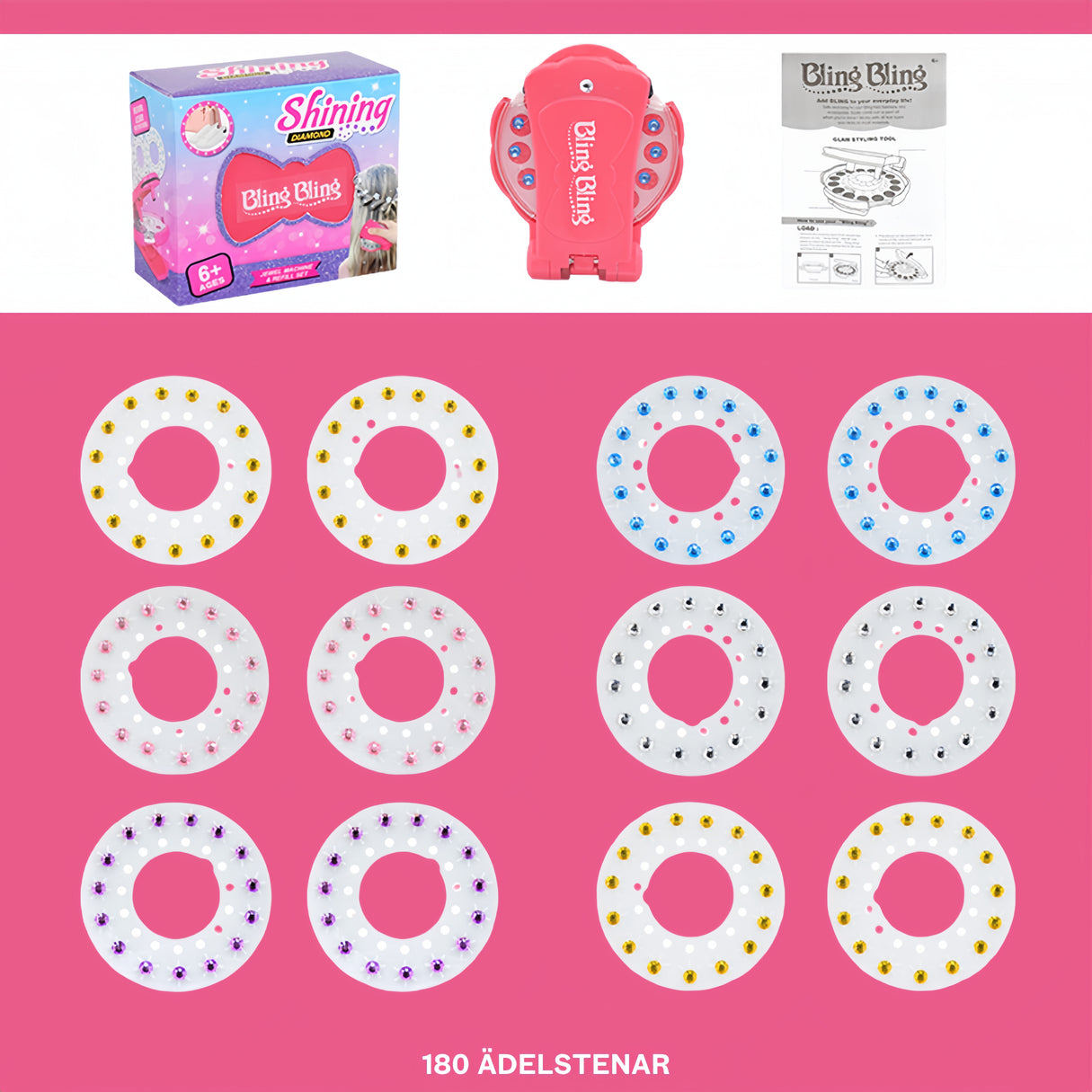 Gör dig redo att skina med vårt Bling™ hårstylingverktyg! Lägg till vackra diamanter och coola accessoarer till ditt hår på några sekunder. Det är superenkelt – klistra bara diamanterna på ditt hår eller vilken yta som helst, och kamma ut dem när du är klar.