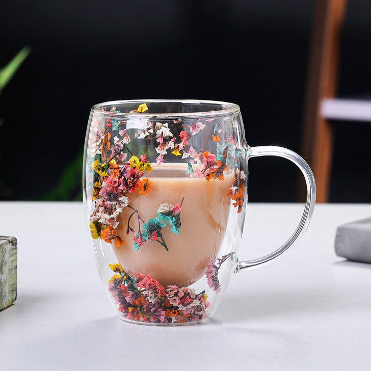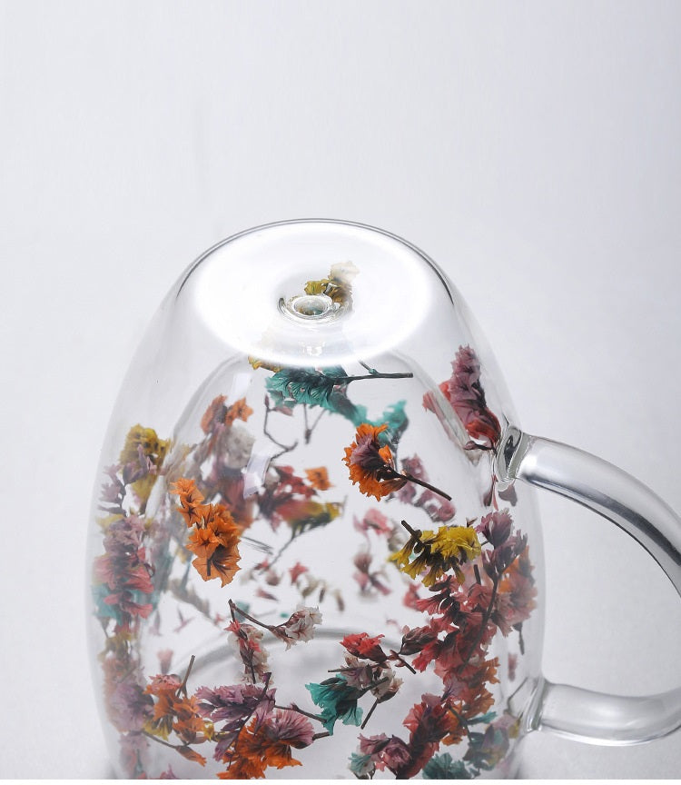 Dubbelväggig glasmugg med torkade blommor