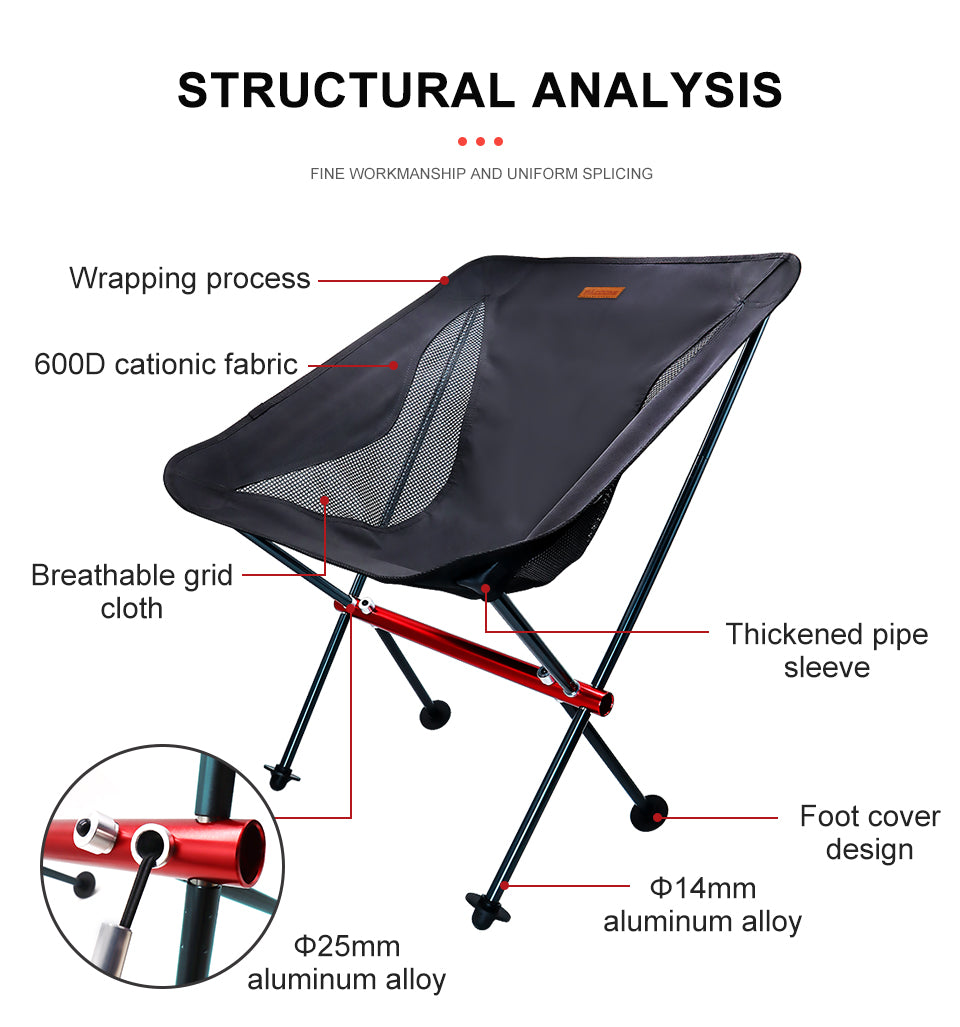 En elastisk rem träder genom de hållbara aluminiumlegeringrören, vilket gör att du kan fälla ut och in stolen på bara några sekunder. Den fällbara designen gör att stolen tar upp ännu mindre plats jämfört med en typisk campingstol.