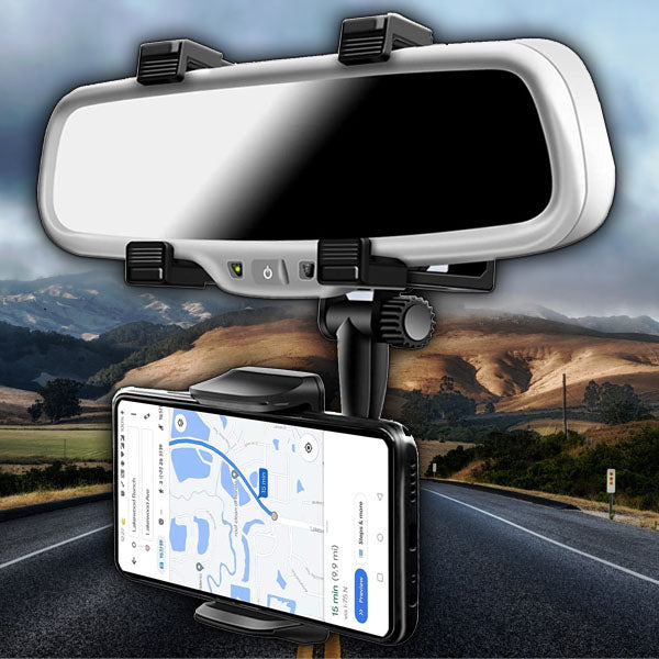 Denna smarta telefonhållare fästs utan verktyg på backspegeln, håller din smartphone säkert i ögonhöjd och ger en perfekt sikt på navigation & samtal – utan att blockera din sikt på vägen. Med 360° rotation, vibrationsdämpande design & silikon-gel-skydd är den den perfekta följeslagaren för varje resa.