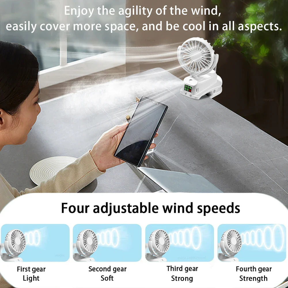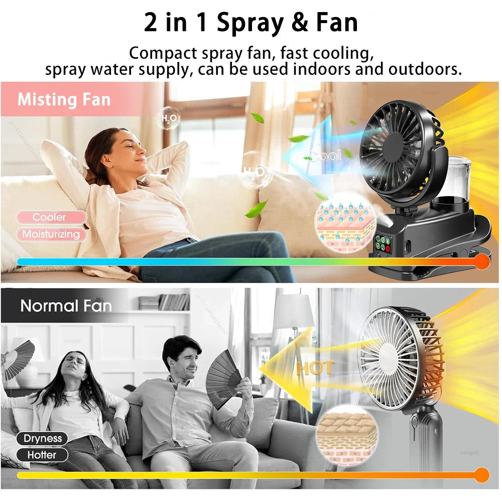 Carvallo Bärbar Sprayfläkt med klipp | 4 hastigheter & 360° roterbar | Mini USB-fläkt med dimma för kontor, bil & camping