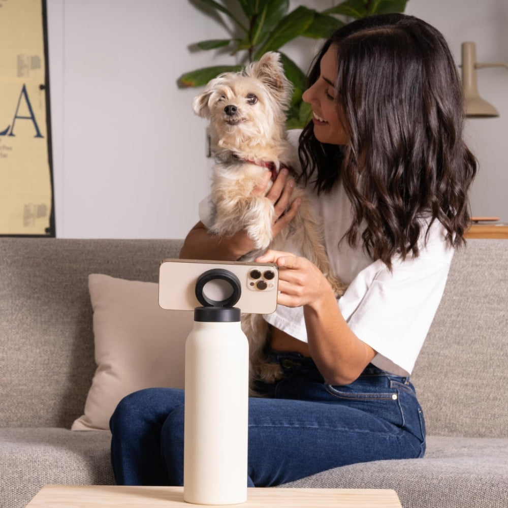 ✔️ Magnetisk telefonhållare direkt på flaskan – Idealisk för selfies, recept, samtal eller träning.