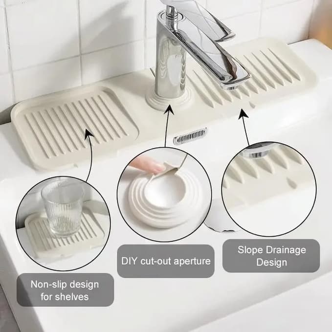 Carvallo passer perfekt runt din kran, förhindrar att vatten stänker överallt och gör rengöringen av bänkskivan till en barnlek. Resultatet? Ingen mer ständig torkning och skrubbning!