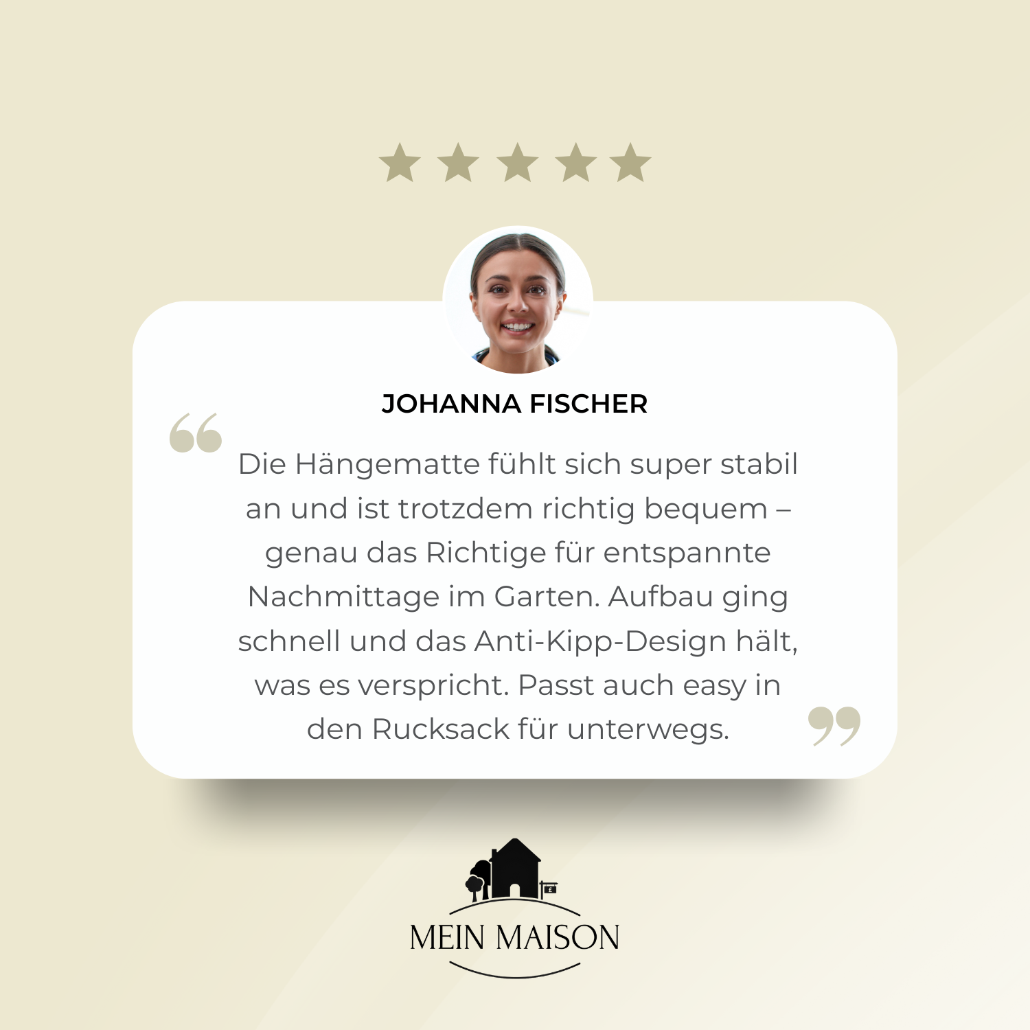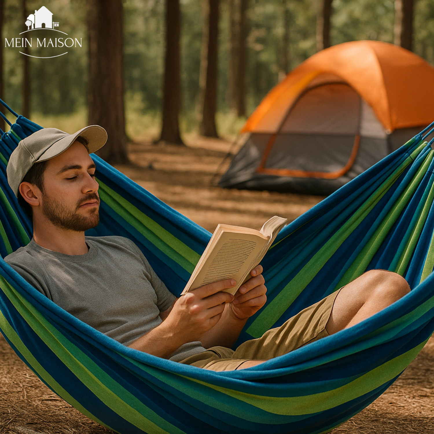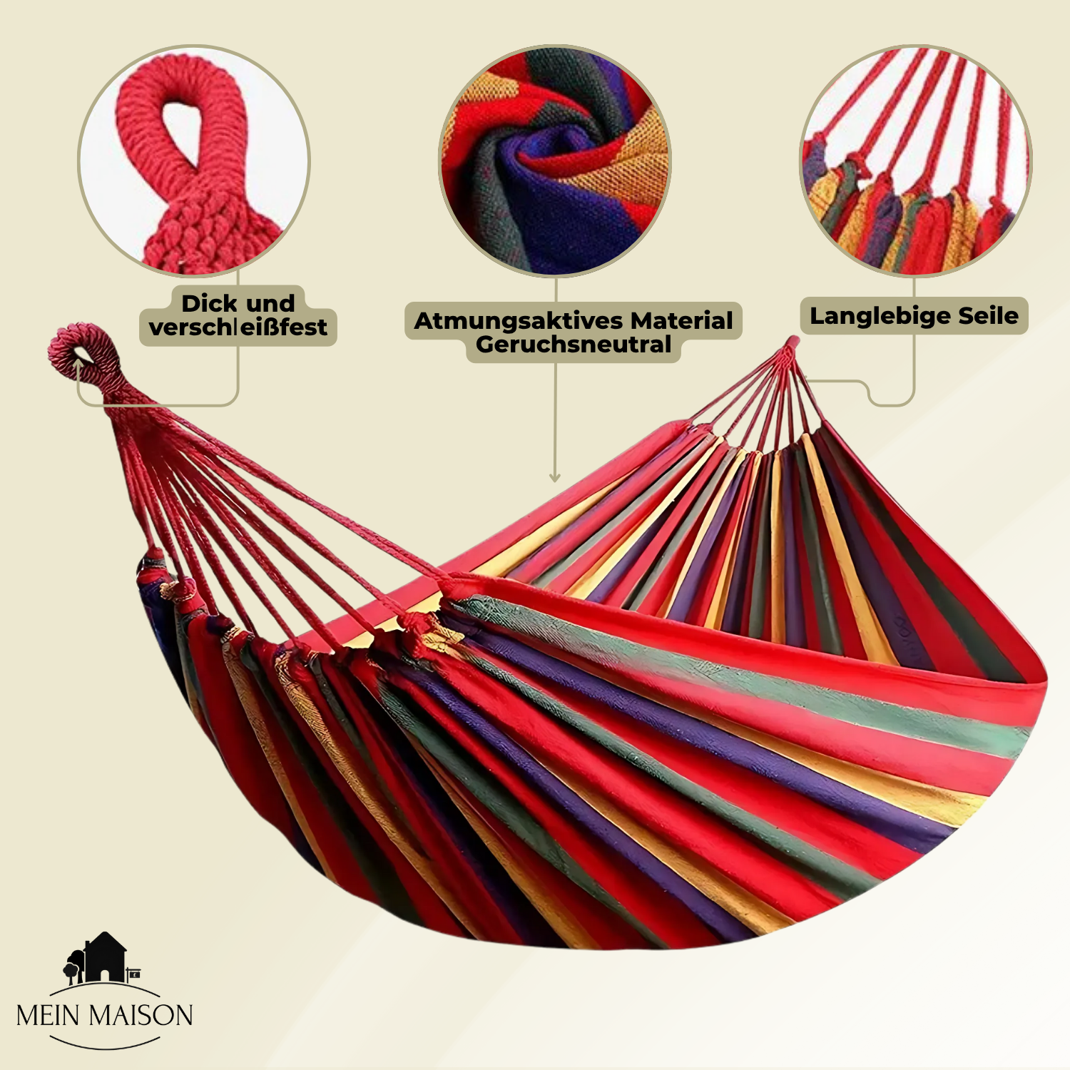 📌 Slitstarkt canvasmaterial: Tillverkad av tätt vävt canvas, erbjuder hängmattan en bekväm liggyta och en imponerande belastning på upp till 200 kg – perfekt för kontinuerlig användning utomhus.