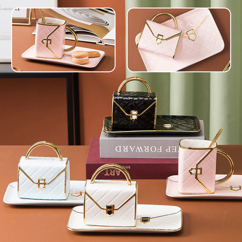 ✓ Snygg och funktionell design: Den handmålade guldkanter och det gyllene handtaget ger muggen ett lyxigt utseende. Den halkfria fatet är perfekt som snacksfat.