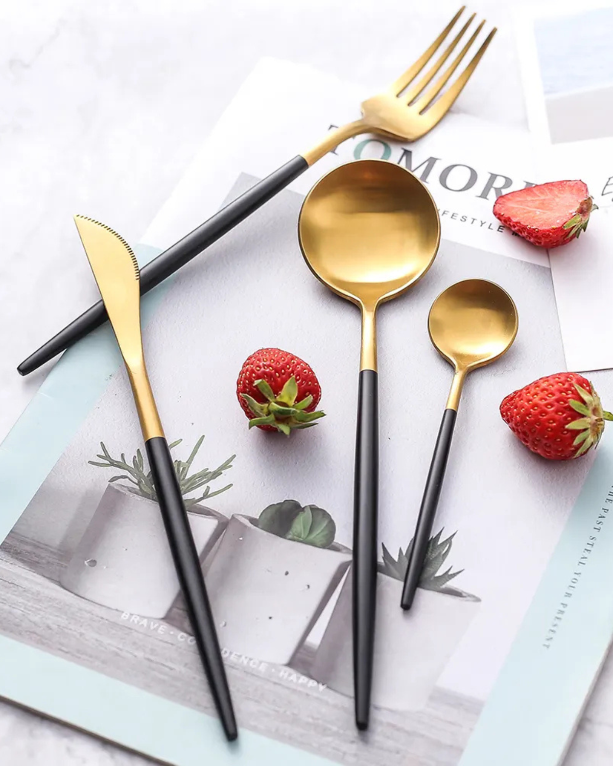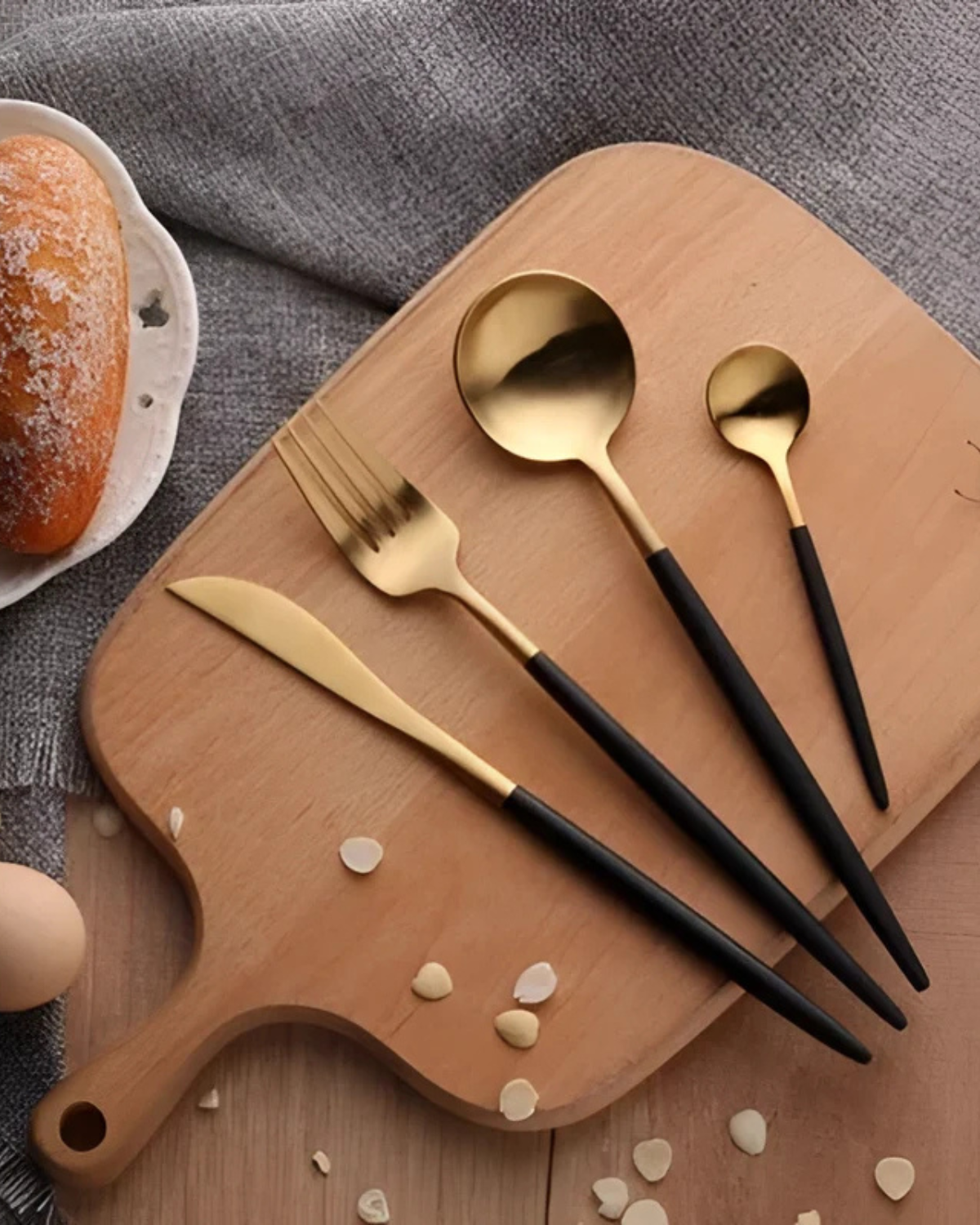 - Exklusiv design – Matt svarta handtag i kombination med glänsande guld besticksdelar.
