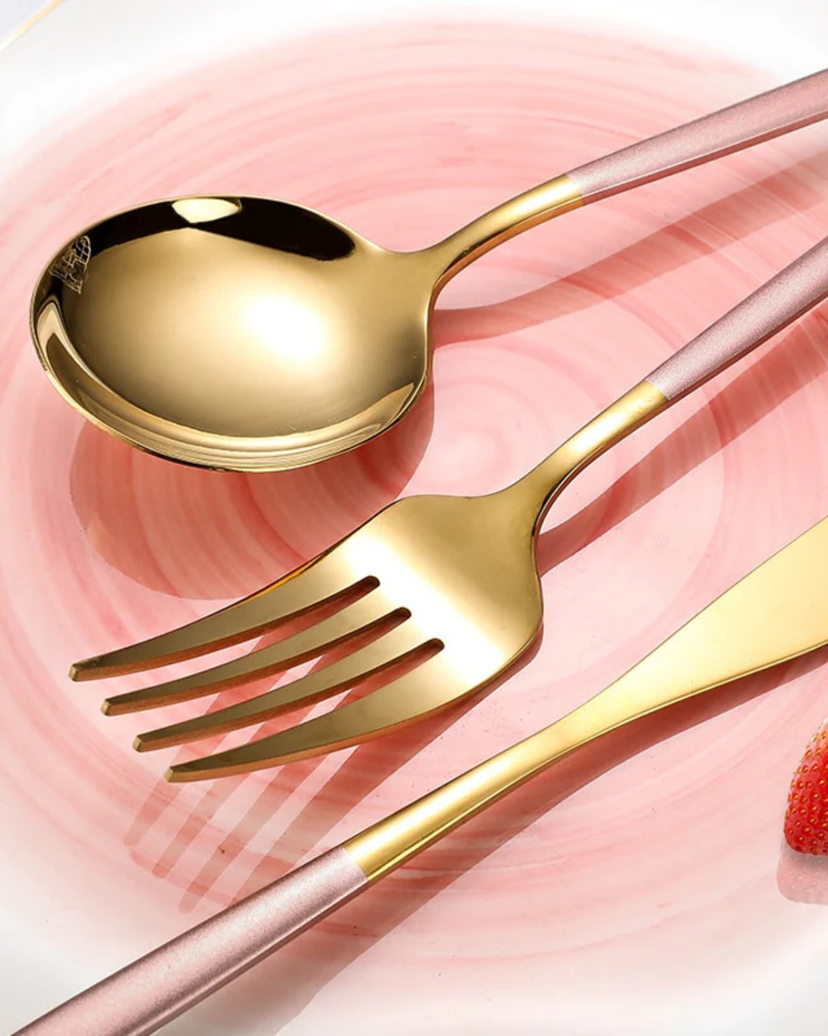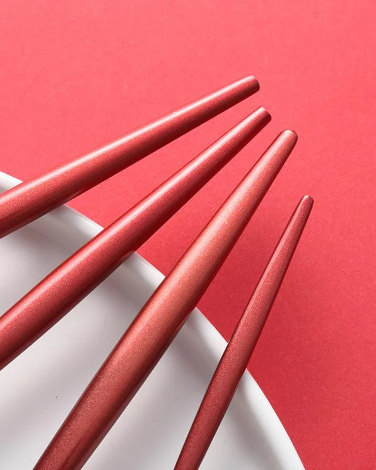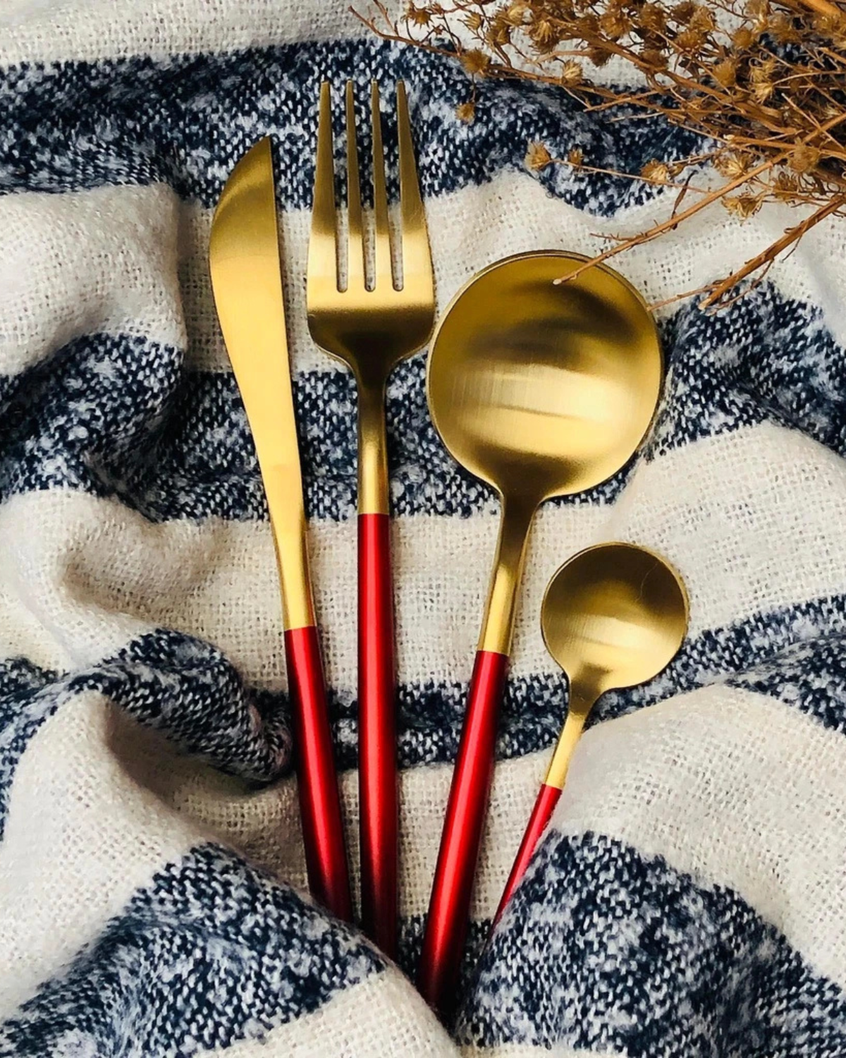 - Mångsidigt 4-delars set – Inkluderar en kniv, gaffel, sked och dessertsked.