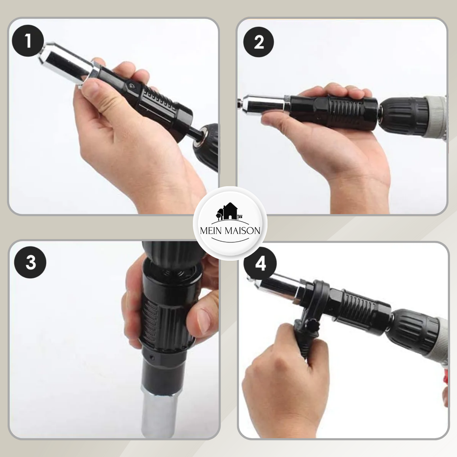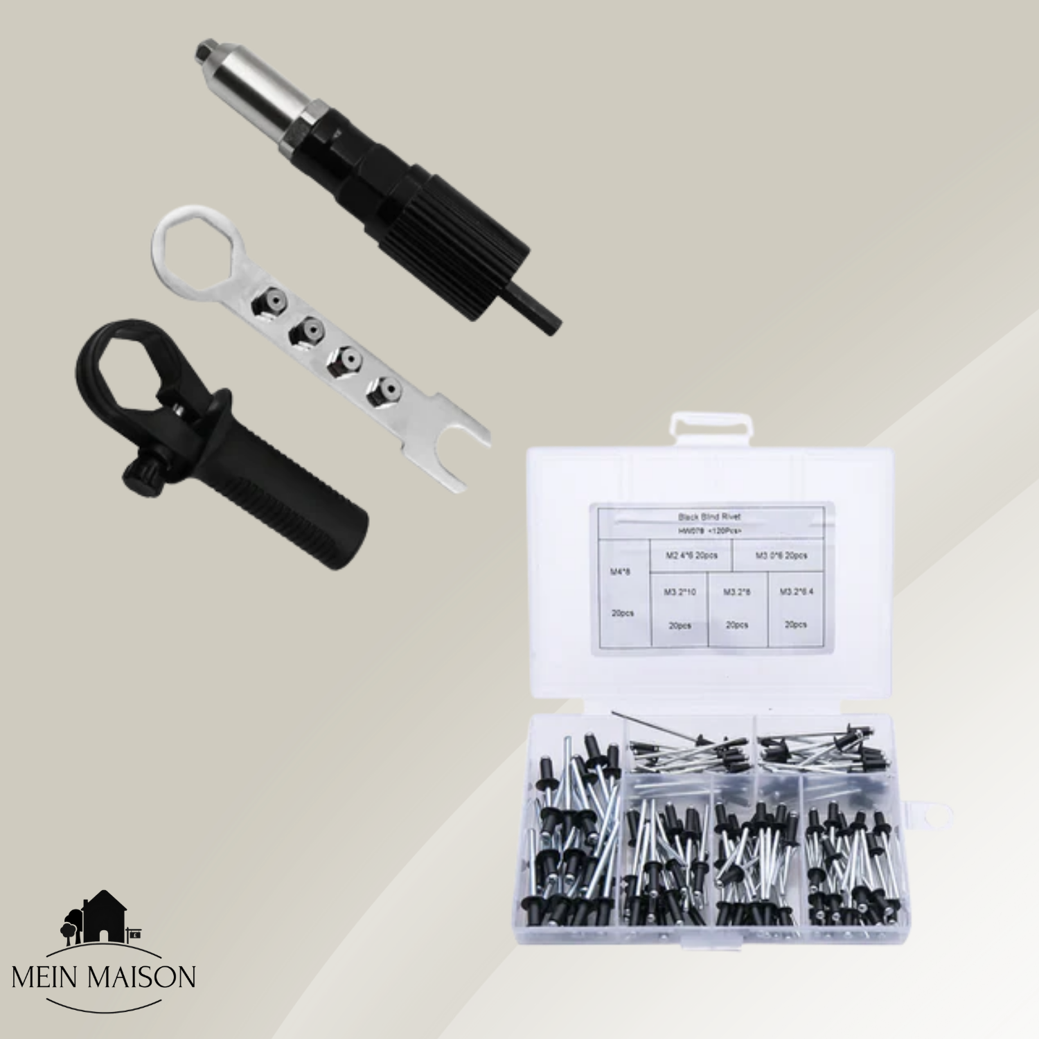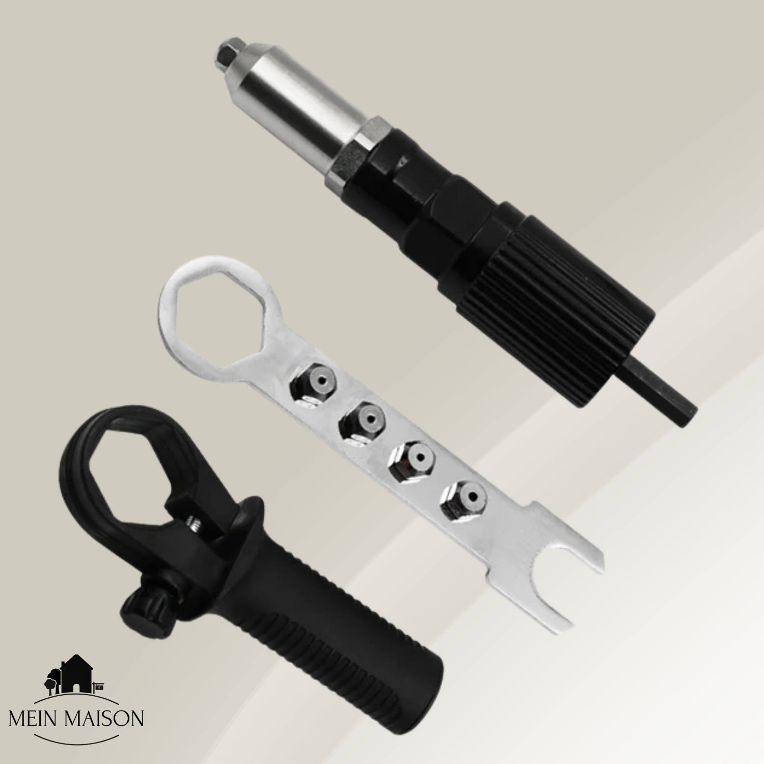Carvallo Max är den kraftfulla adaptern för varje borrmaskin, med vilken du snabbt skapar stabila nitar. Med 4 utbytbara munstycken, över 100 högkvalitativa nitar och ett säkert anti-glidhandtag är du perfekt utrustad för varje reparation eller montering.