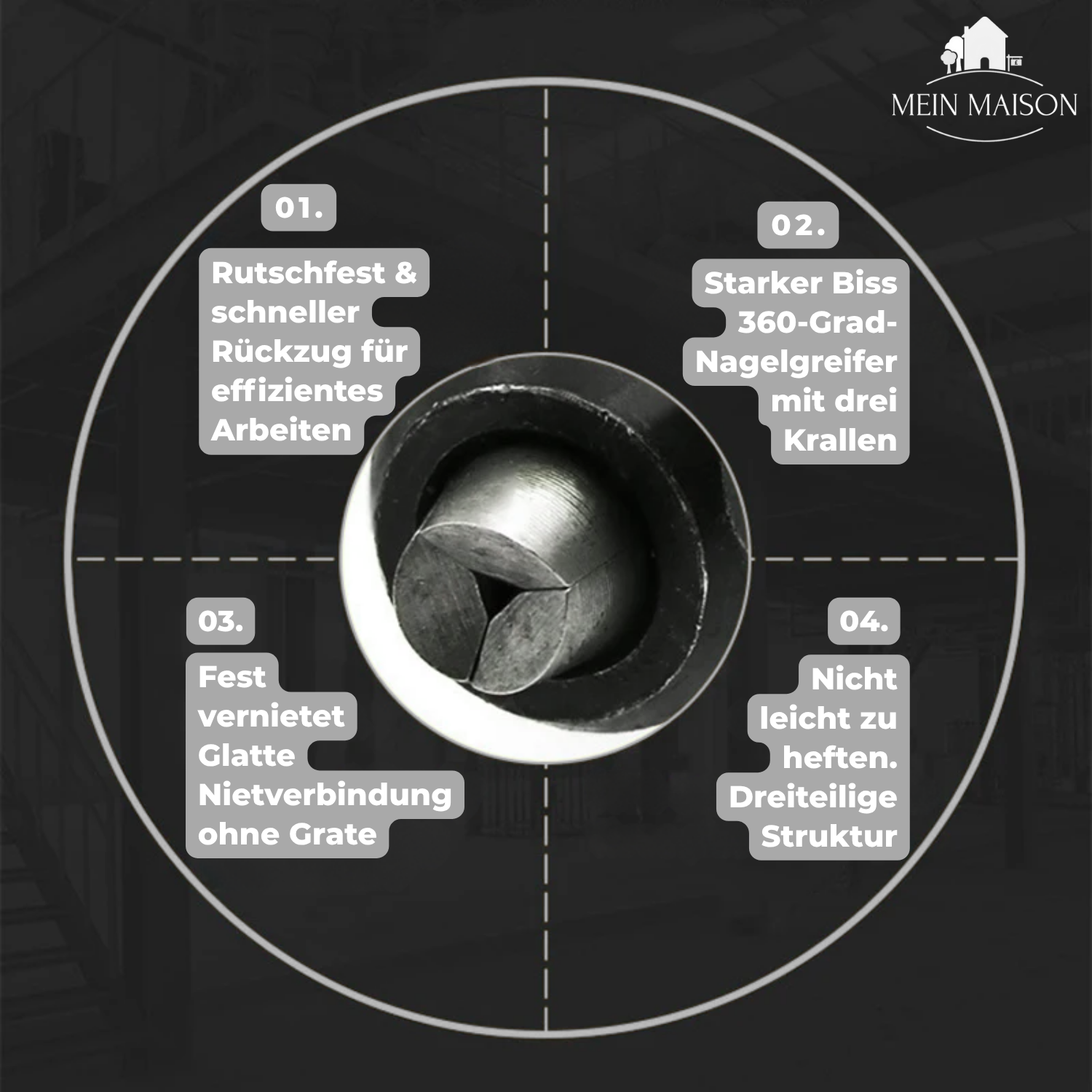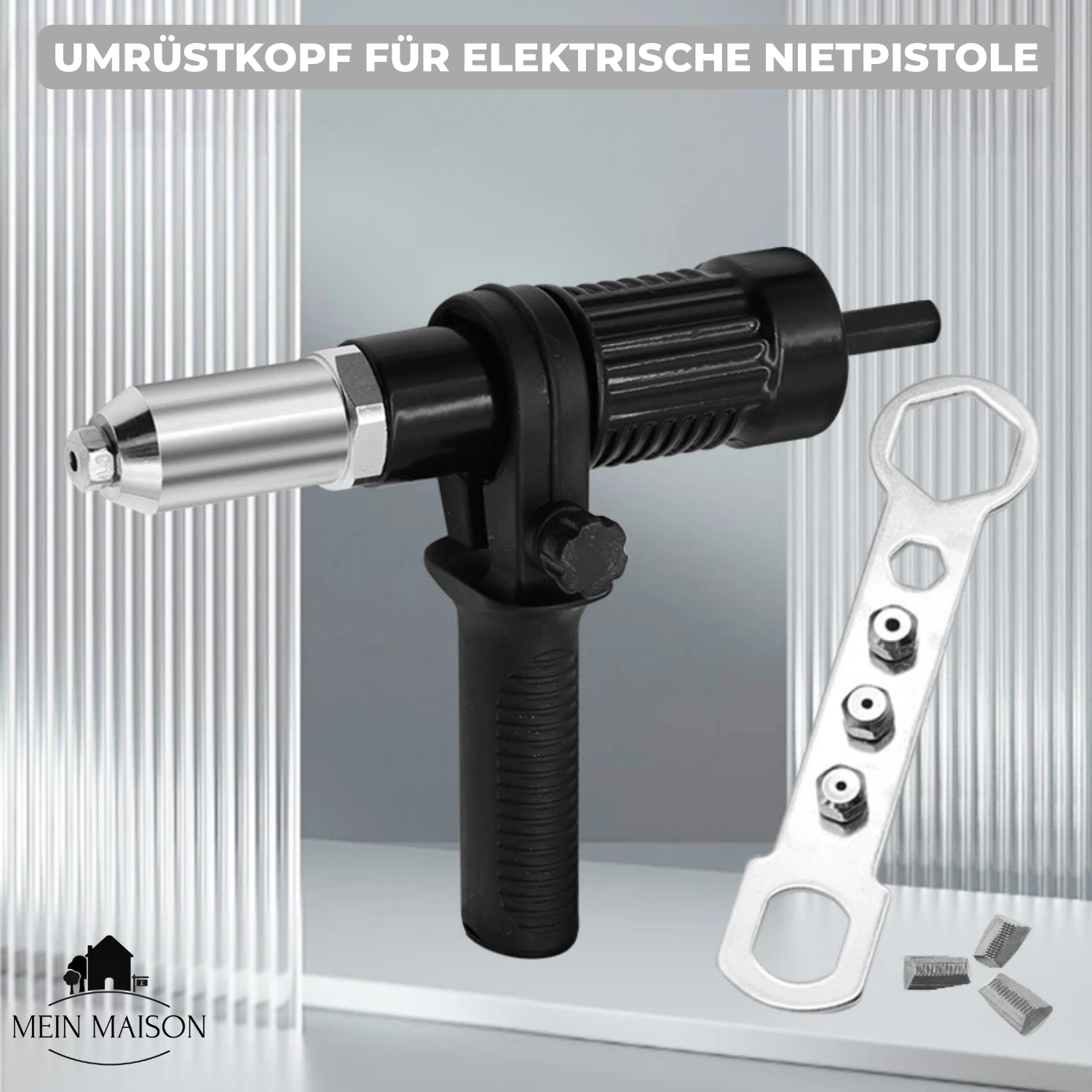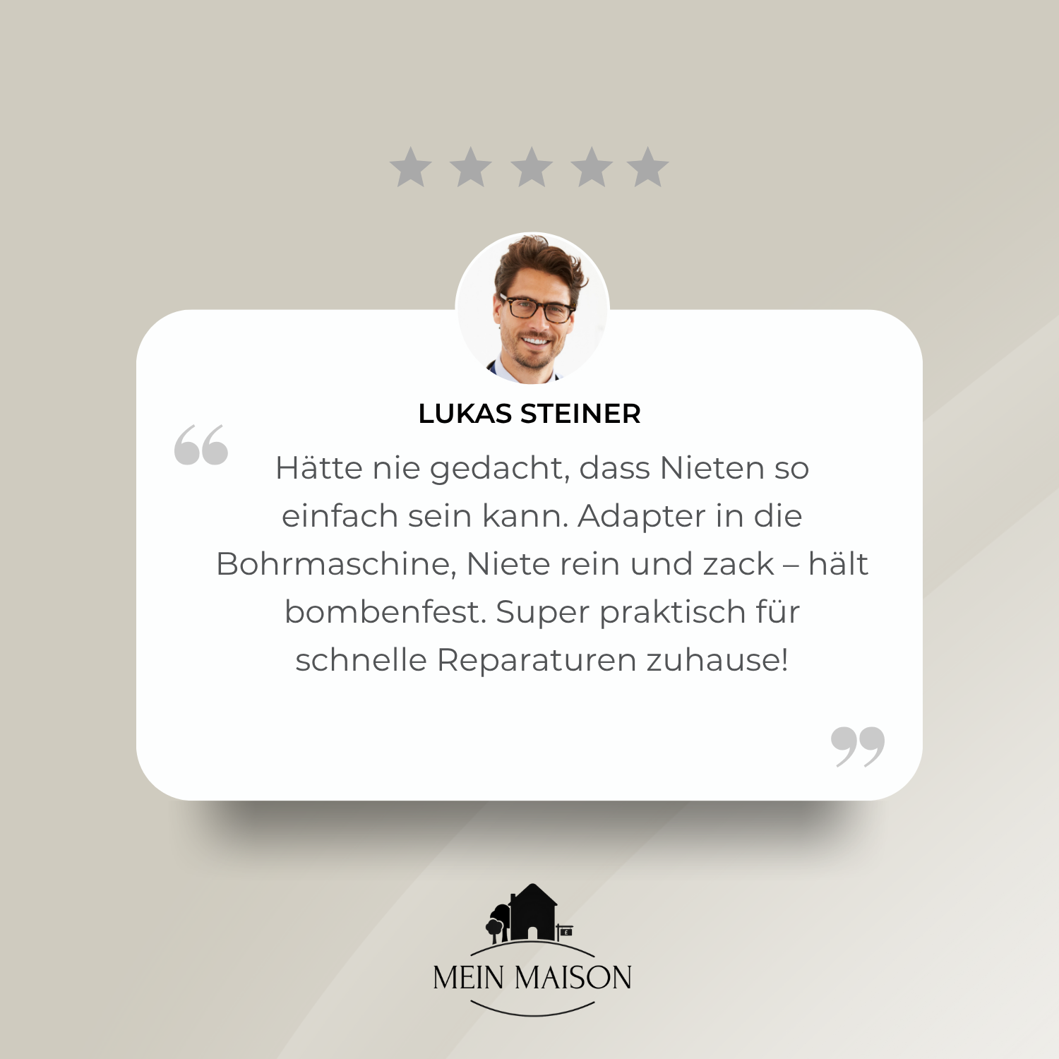 Carvallo Max är den kraftfulla adaptern för varje borrmaskin, med vilken du snabbt skapar stabila nitar. Med 4 utbytbara munstycken, över 100 högkvalitativa nitar och ett säkert anti-glidhandtag är du perfekt utrustad för varje reparation eller montering.
