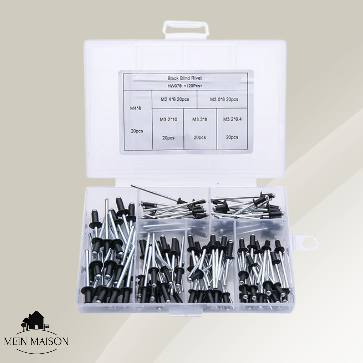 – 120x blindnitar (storlekar: M2,4×6 mm till M4×8 mm)