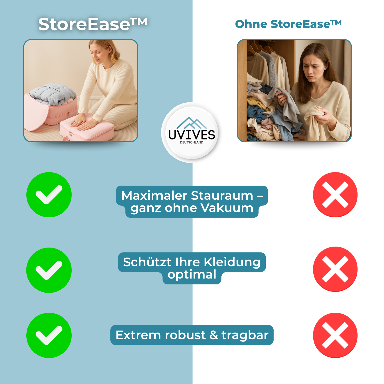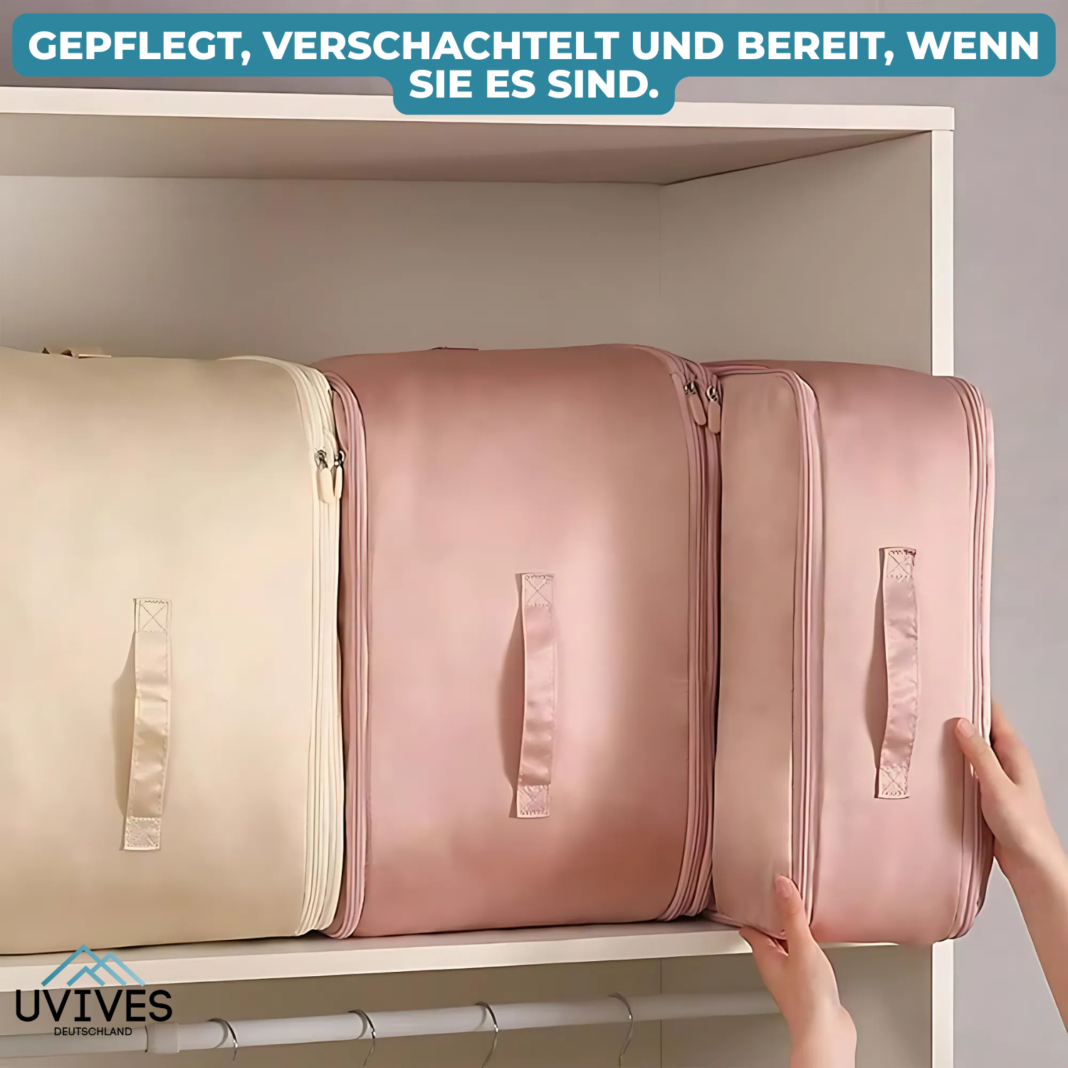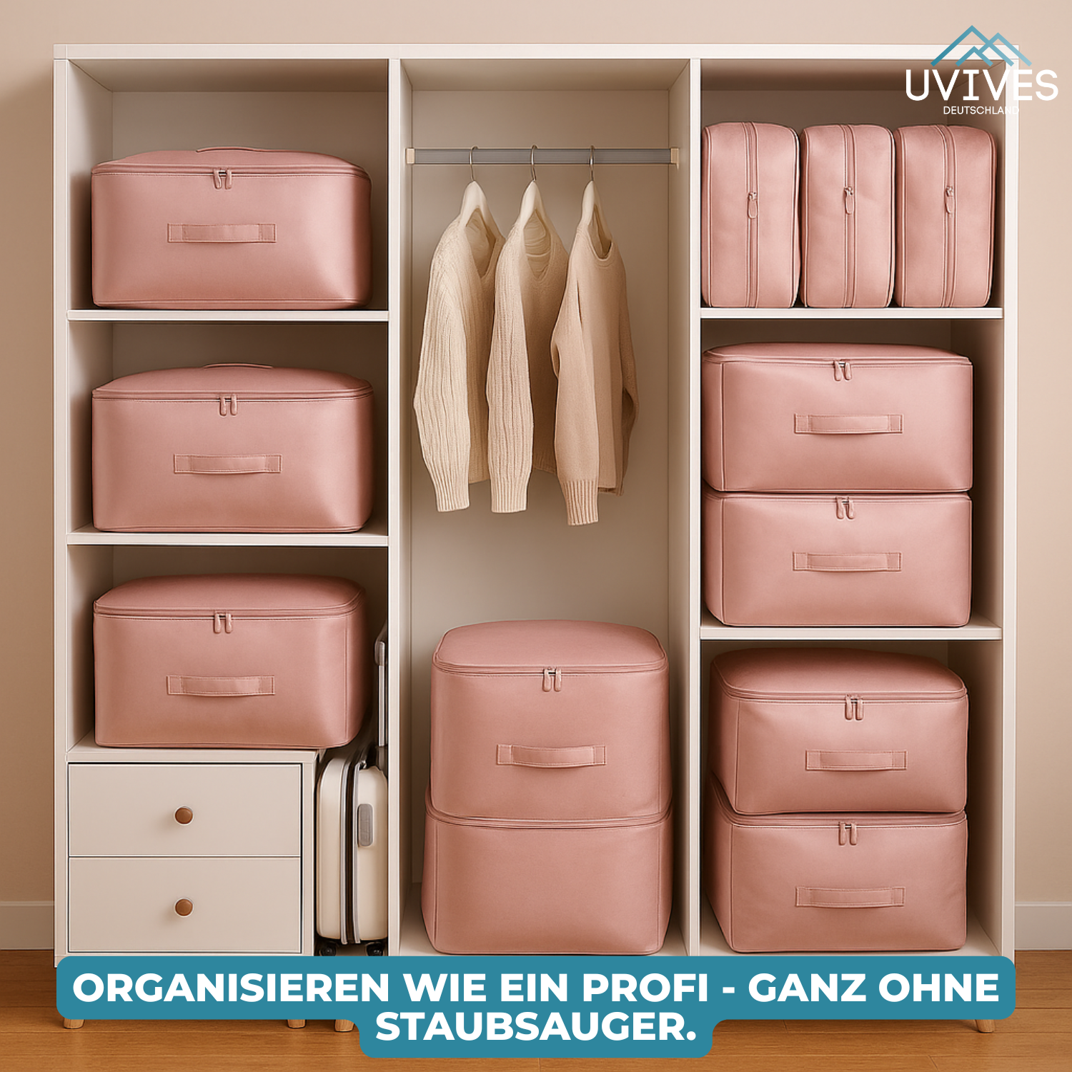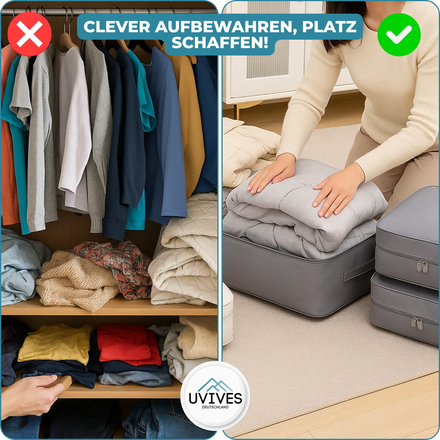 ✔️ Minskar volymen omedelbart med upp till 40 %: Den speciella dragkedjemechanismen pressar ut överflödig luft – helt utan teknik. Så mycket mer ryms i resväskor, skåp eller förvaringslådor.