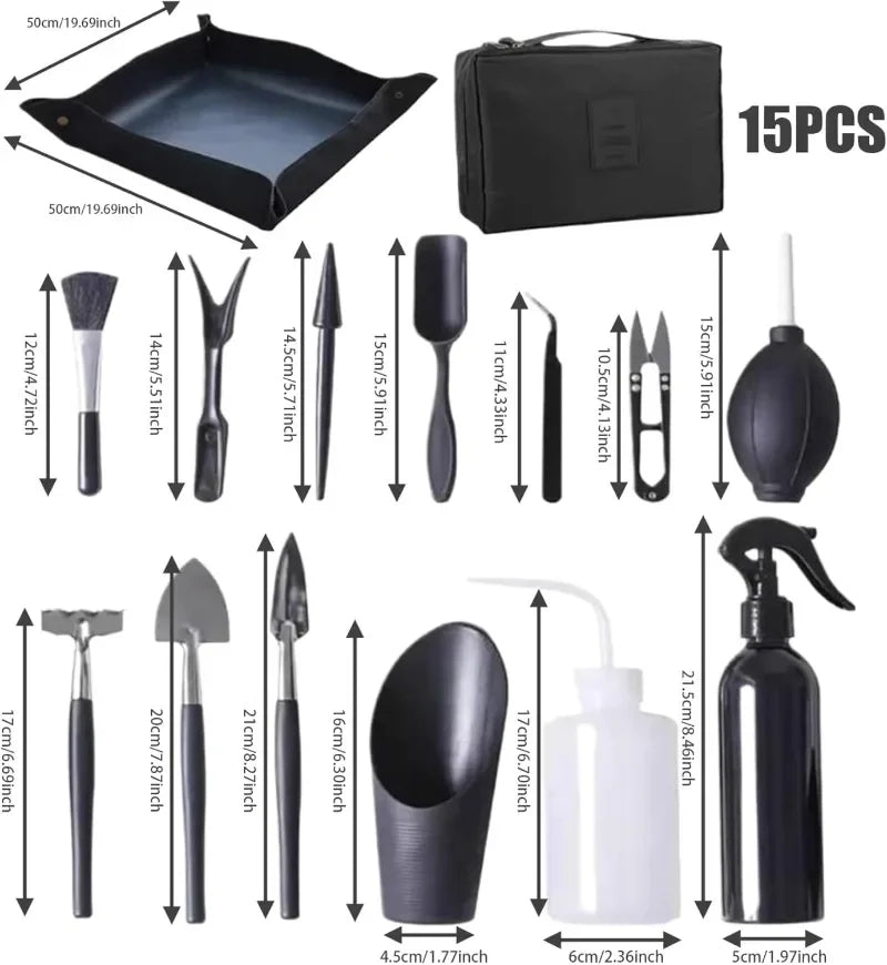 Carvallo MicroGarden Set 15-delat bonsai- & suckulentträdgårdsverktygsset | Med väska & planteringsmatta | För omplantering, beskärning & skötsel