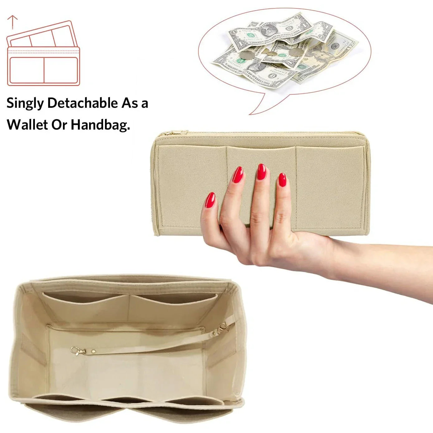 ✨ Avtagbar mittdel & nyckelband – Avtagbart zip-fack som kan användas som mini-väska eller plånbok. Det extra långa filtnyckelbandet gör slut på letandet efter nycklar!
