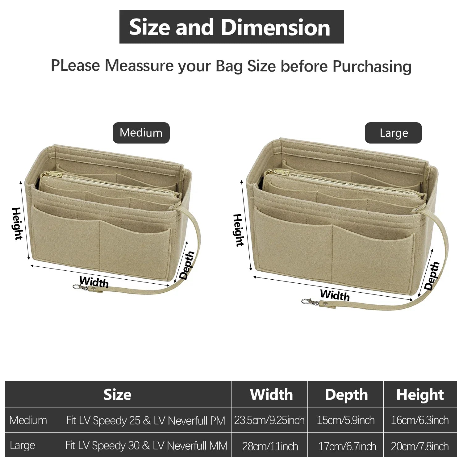 Kompatibilitet: Passar för vanliga tote bags & handväskor (t.ex. Speedy, Neverfull)