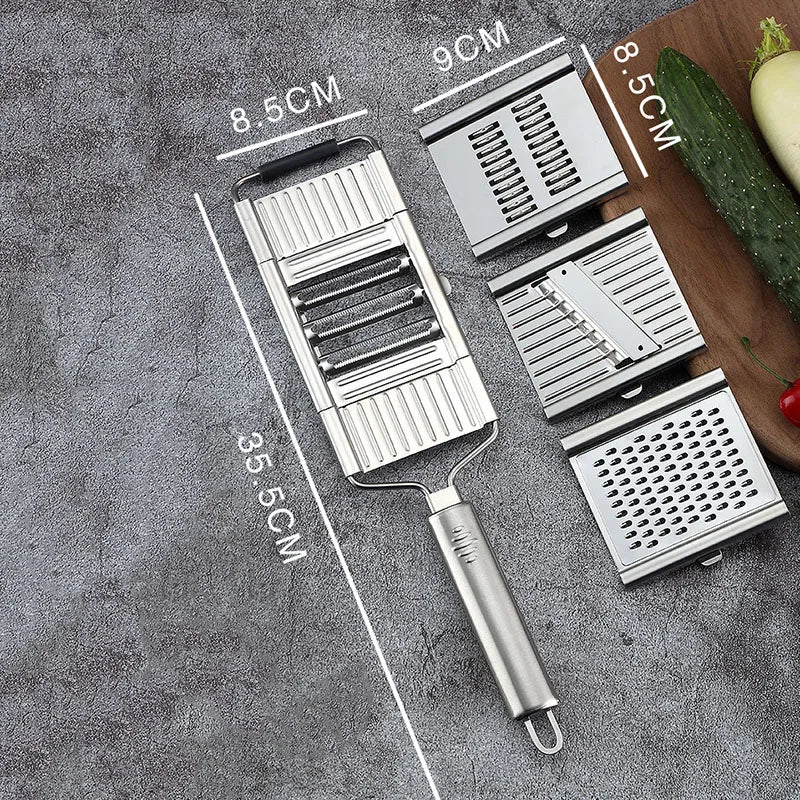 📌 Fyra utbytbart rostfria stålblad – För skivor, julienne, rivet och fina strimlor – allt i en kompakt enhet.