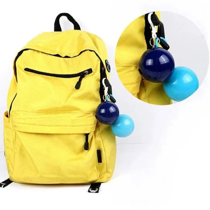 📌 Alltid till hands – Tack vare den praktiska karbinhaken kan Poncho-Ballen enkelt fästas vid nyckelringen, ryggsäcken eller bältet.