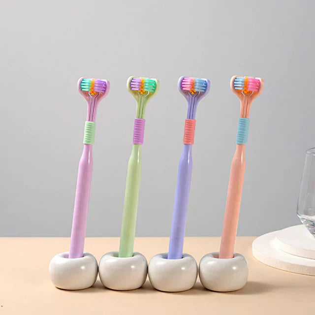 Borsten omger varje tand och rengör automatiskt från tre sidor samtidigt – utan särskild teknik.