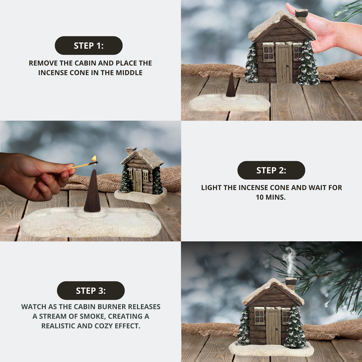 För en angenäm upplevelse, tänd rökelsekegeln och vänta i 10 minuter. Titta på hur stughållaren släpper ut rök och skapar en realistisk och mysig atmosfär.
