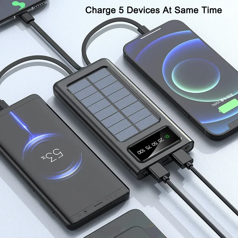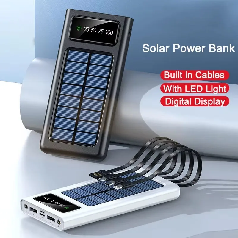 Carvallo Solar Powerbank | 10.000/20.000 mAh | Snabbladdningsfunktion & 4 integrerade kablar | För iPhone, Samsung, Huawei & mer