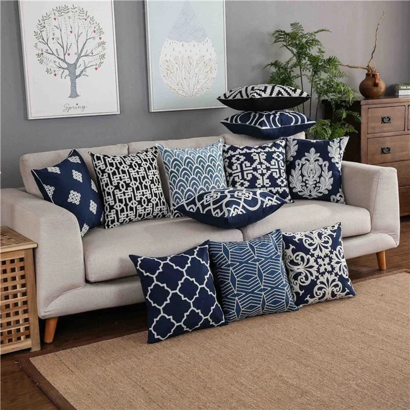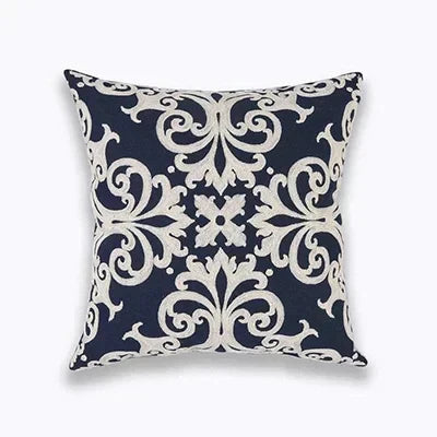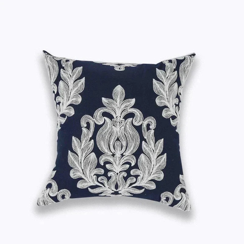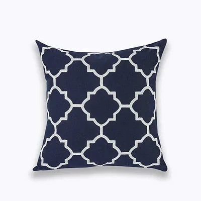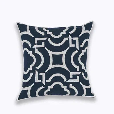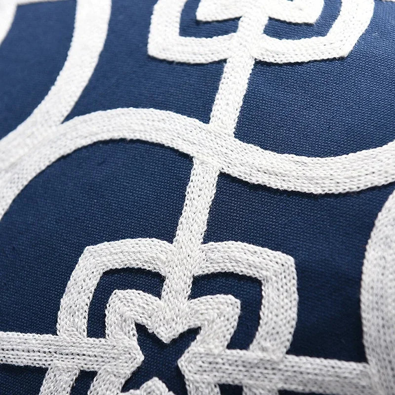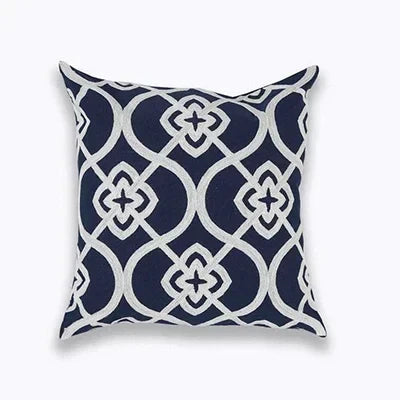 Berika ditt inre med den eleganta Carvallo Broderade Kuddöverdrag. Detta lyxiga 45x45 cm kuddöverdrag kombinerar förfinad hantverksskicklighet med tidlös stil. Det geometriska quatrefoil-mönstret, som är skickligt broderat i djup mörkblått och klart vitt, ger en känsla av klass till vilket utrymme som helst.