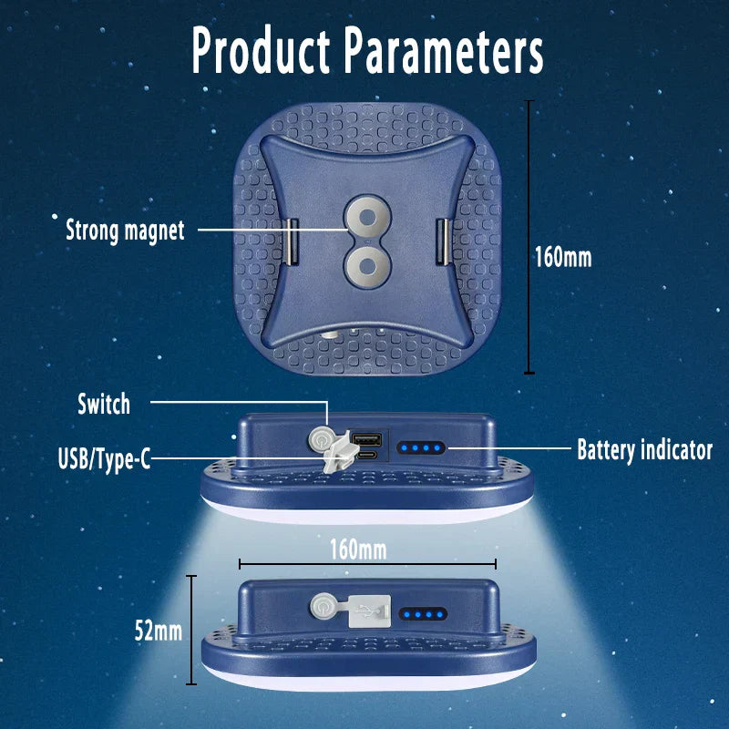 🧲 Magnetiskt & hängande: Två starka magneter för enkel fästning på metallytor + halkfritt hängare & bärrem – perfekt för tältstänger, motorhuvar eller arbetsbänkar.