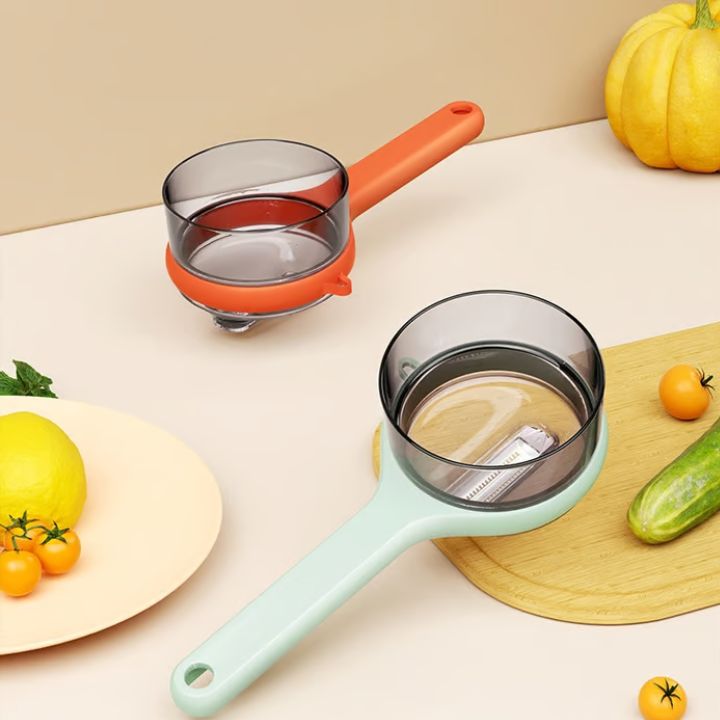 Den dubbelsidiga rostfria stålbladet och den integrerande uppsamlingslådan gör den till den perfekta köksassistenten.