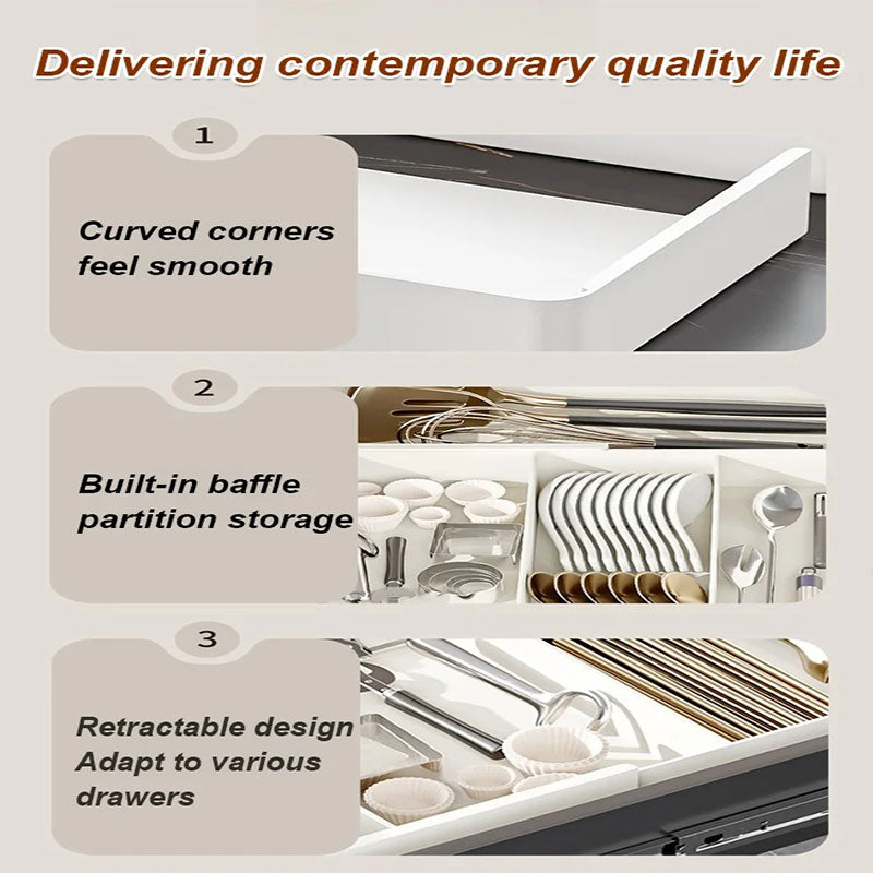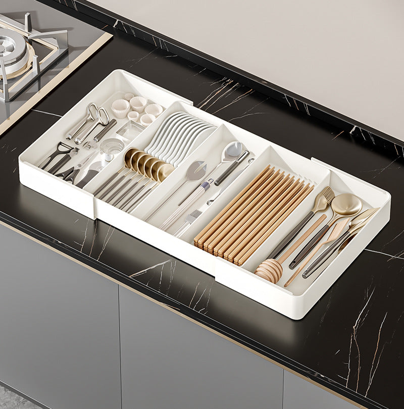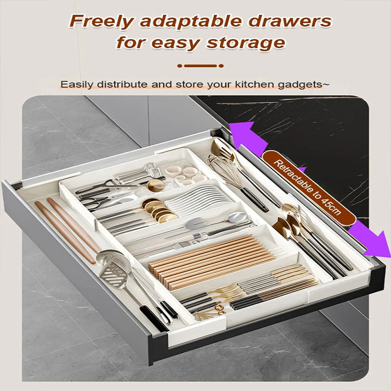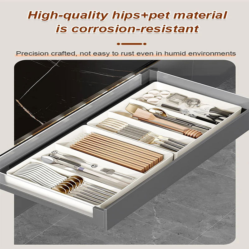 UTBYGGBAR DESIGN - Organisatörerna har en innovativ utbyggbar design som gör att du kan justera längden för att passa olika skåp- eller lådstorlekar, vilket säkerställer en perfekt passform varje gång.