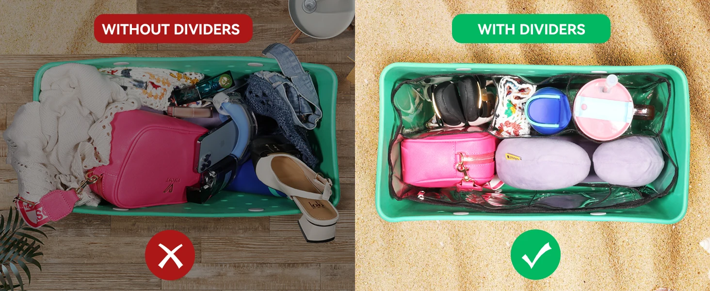 Carvallo Strandväske-Organizer ger ordning i varje stor strandväska – helt utan montering eller ombyggnad. Sätt bara in den, och njut omedelbart av mer förvaringsutrymme och översikt – oavsett om du är på stranden, vid poolen eller i vardagen.