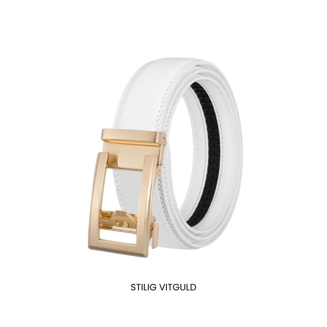 QuickFit-systemet gör att du kan justera bältet utan traditionella hål, vilket garanterar en perfekt passform varje gång. Dra enkelt åt bältet och tryck på knappen på spännet för att lossa det. Finns i 130 cm för Stilig Svartguld, Stilig Brunguld, Stilig Vitguld och Kyckling Svartguld, samt 120 cm för Ikonisk Svartsilver.