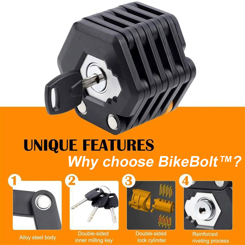 Vi presenterar BikeBolt, det lätta och praktiska cykelsäkerhetsverktyget som är gjort för att motverka stöld under en snabb tur. För att rulla ut det hopfällbara låset, sätt i nycklarna, vrid och vik ut, tryck bara tillbaka den särskilt designade låsmekanismcylindern för att återföra det till den kompakta byggnaden. Med vårt lås blir cykeln enkelt och smidigt säkrad till en stolpe, ställning och andra cyklisters parkering genom att linda den runt hjulet och cykelramen.