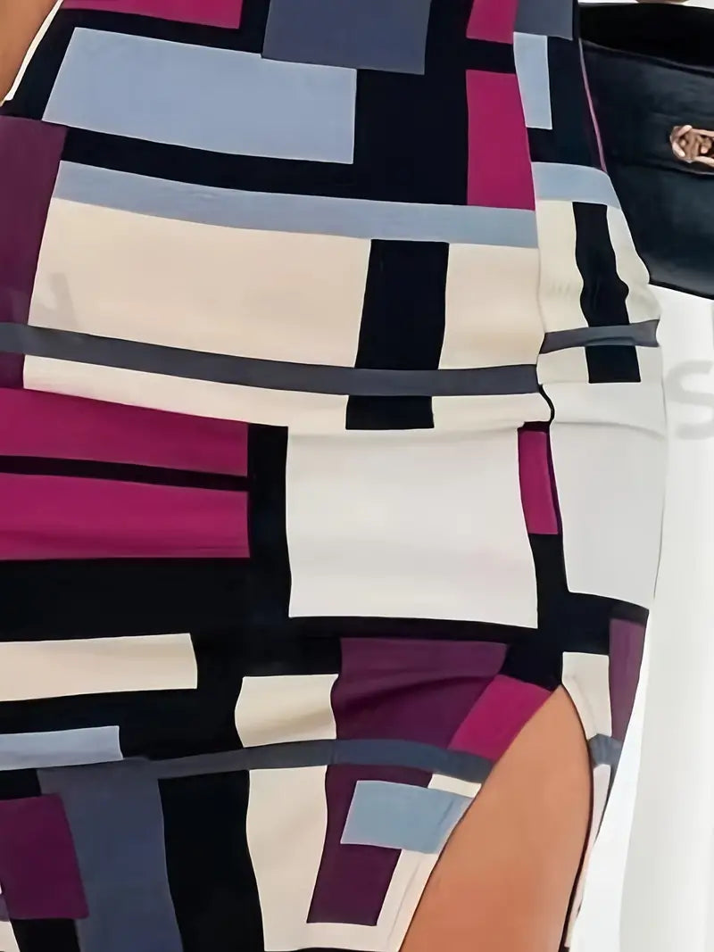 Klänningen har en unik färgblockdesign som framhäver din figur och ger en fräsch look. Den är idealisk för både vardagliga och mer formella tillfällen, vilket gör den till ett mångsidigt tillskott i din garderob.