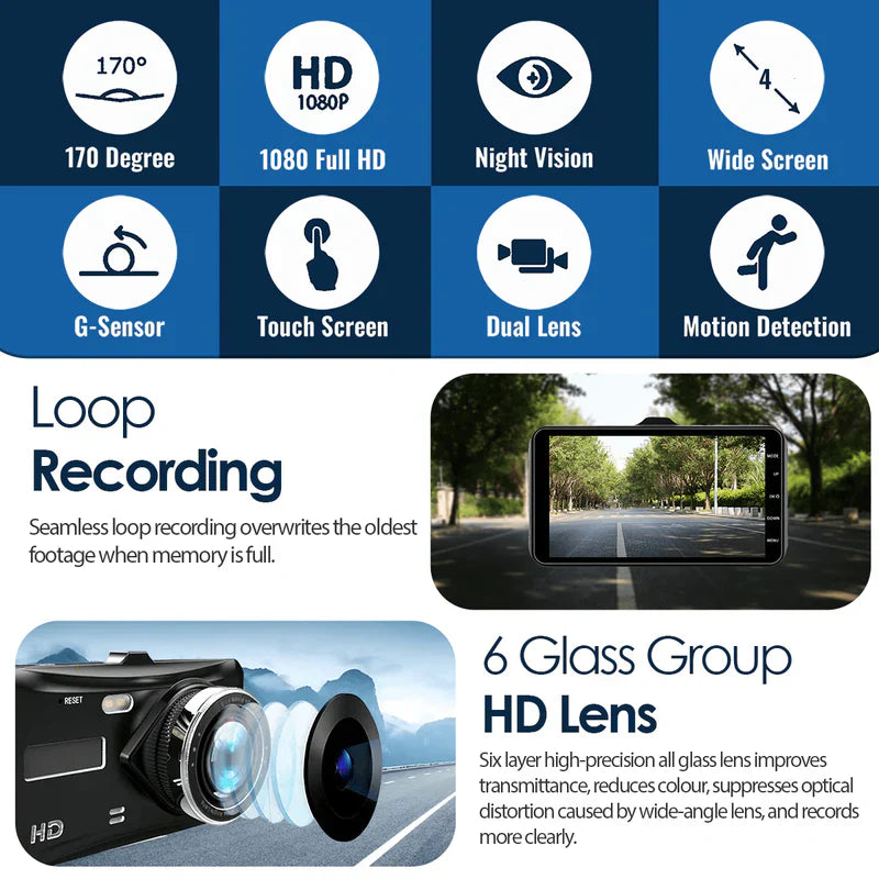 Denna avancerade dash cam erbjuder full bilsäkerhet genom att spela in från både fram- och bakkameror. Den börjar automatiskt fånga footage i Full HD när du startar ditt fordon. Med en inbyggd kollisionssensor, 4-tums skärm och enkel användning är den idealisk för förare som vill skydda sina nära och kära, tillhandahålla bevis vid olyckor och minska försäkringskostnader.