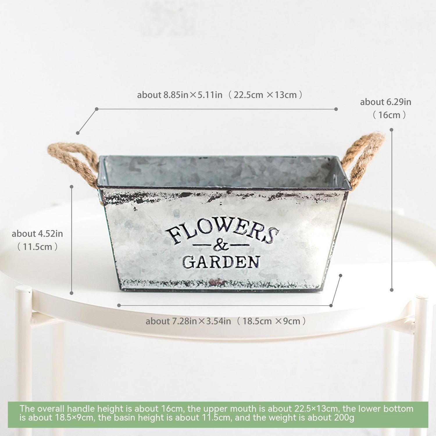 Dekorativ blomster- och trädgårdsbehållare i metall med hampasnörehandtag