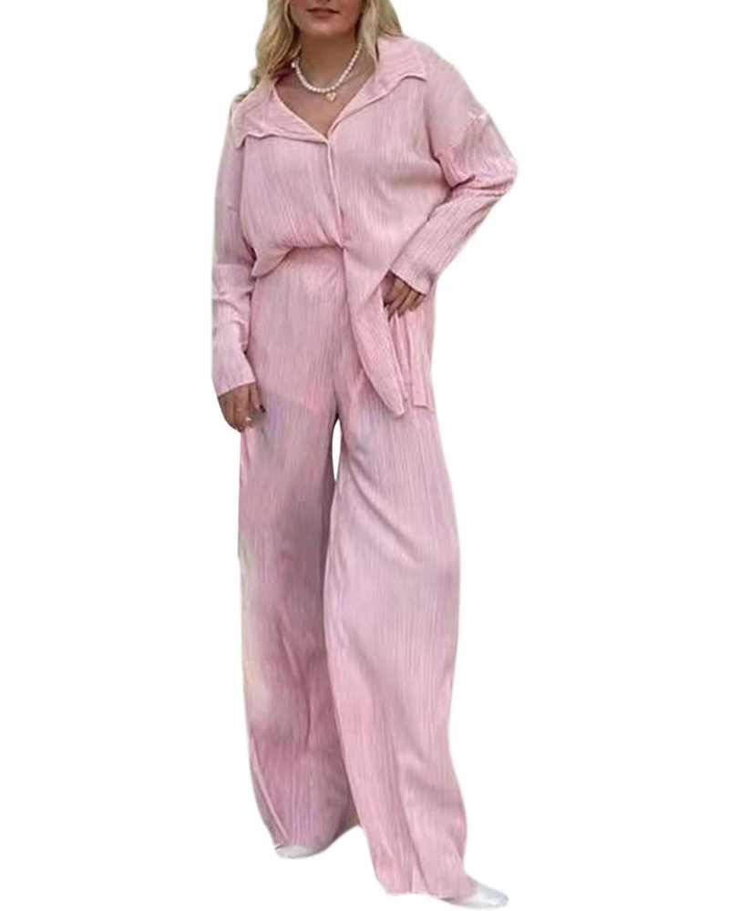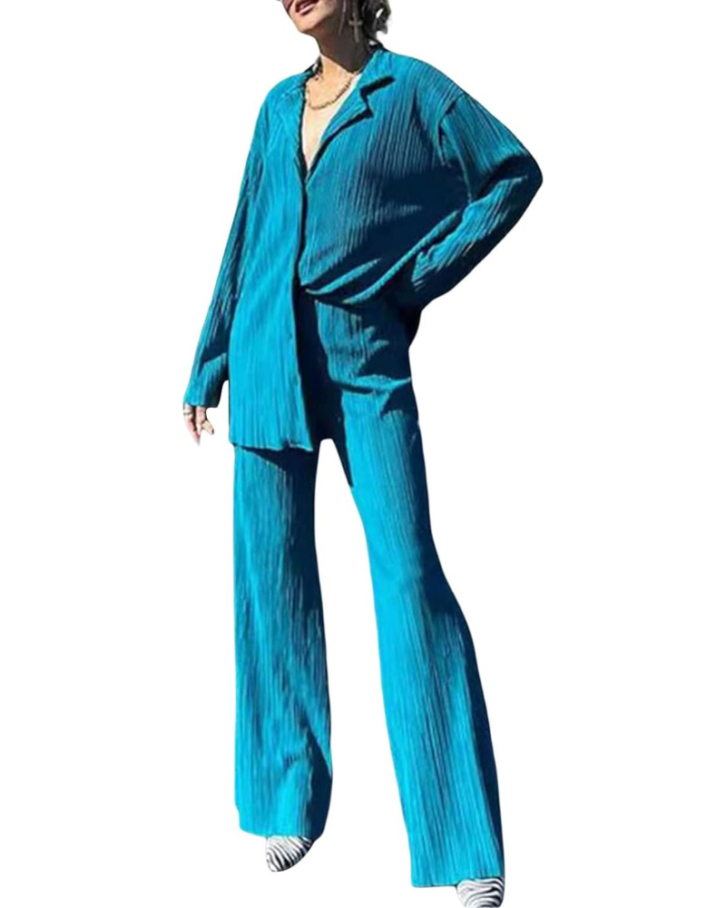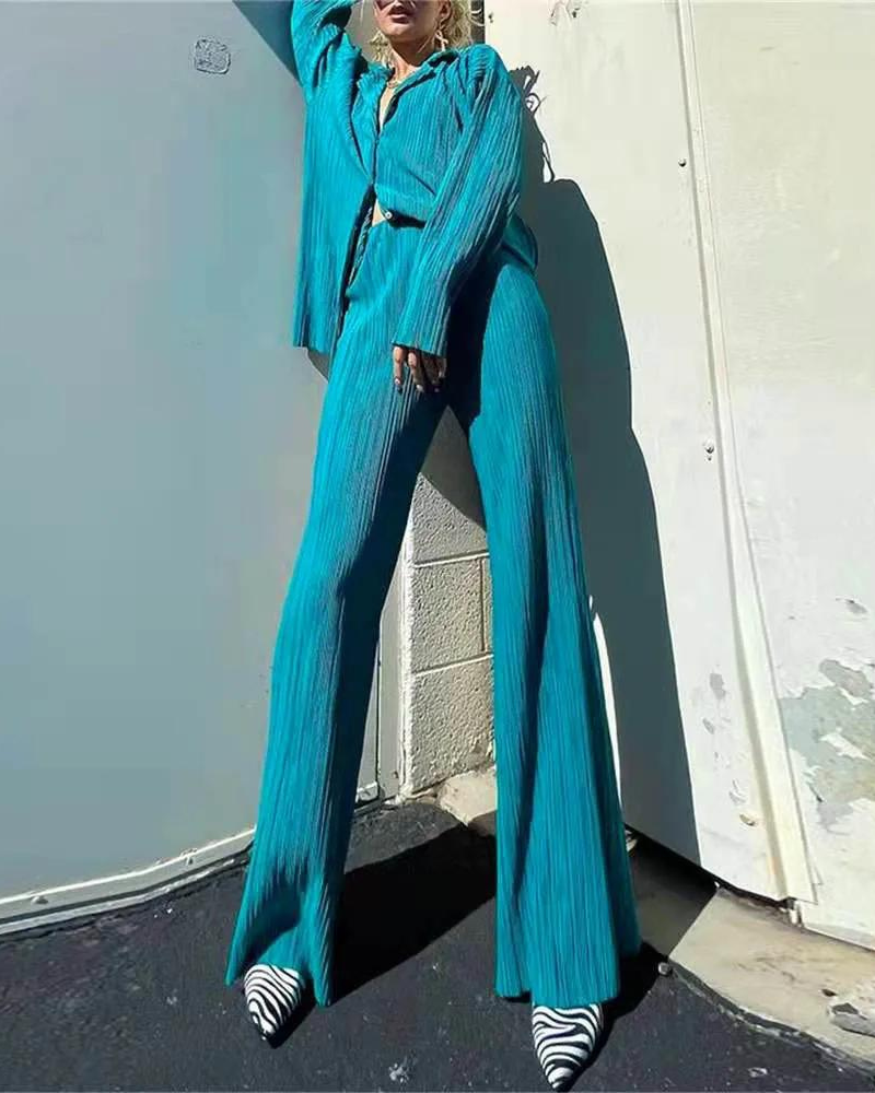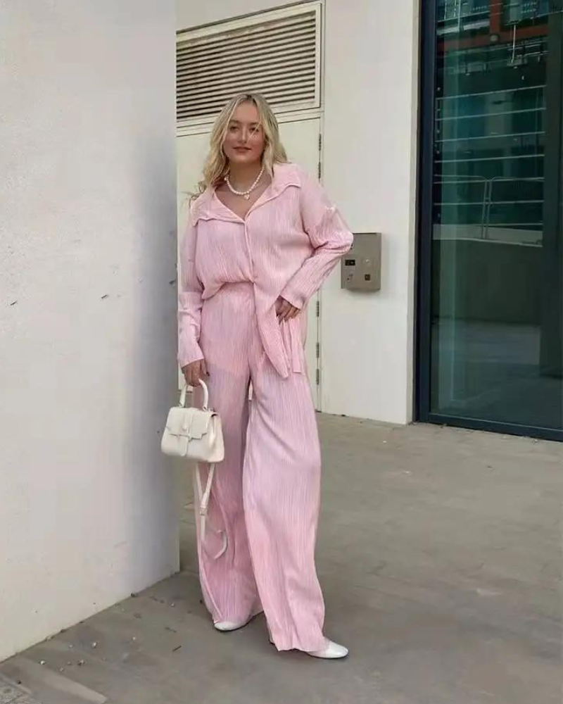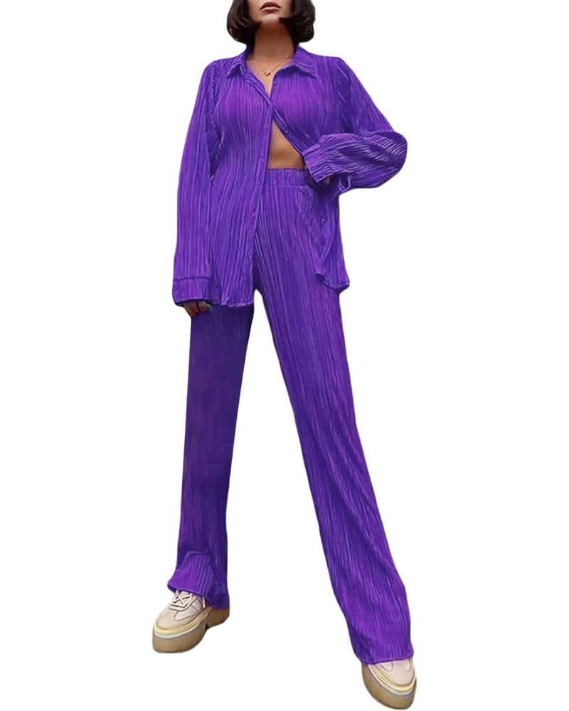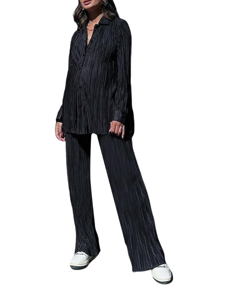 Uppnå enkel elegans med vår Elegant plisserad duo för kvinnor, designad för att få huvuden att vända sig vart du än går. Omfamna komfort och stil med den avslappnade passformen och enfärgade 2-delade setet, som består av en långärmad skjorta med knappar och byxor med raka ben.